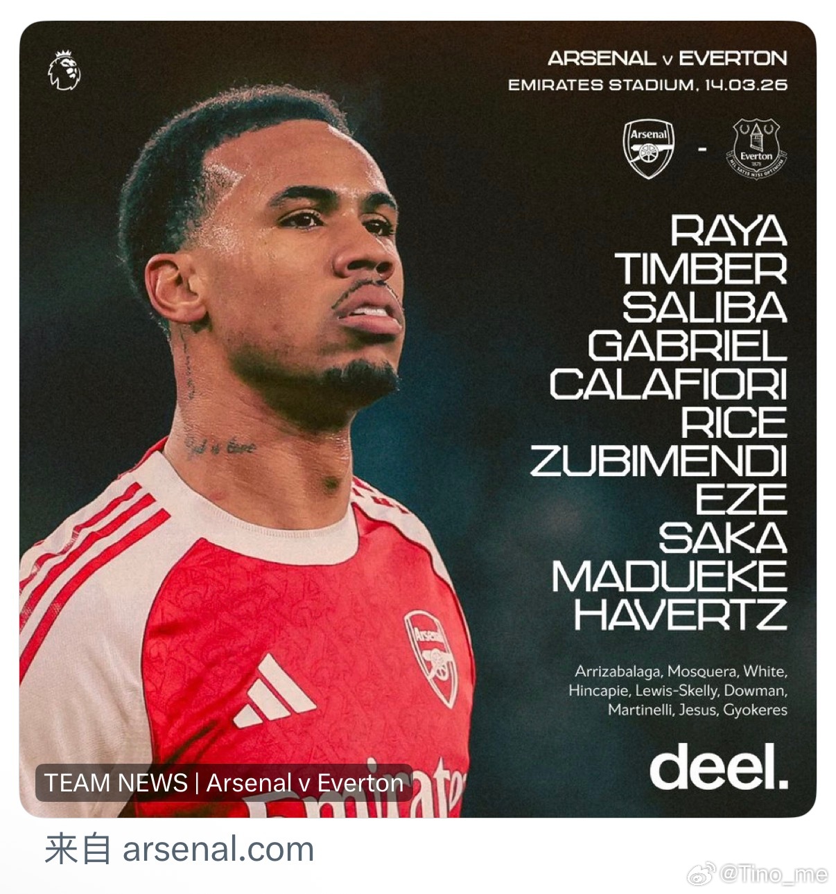 咖啡、萨卡、马杜、哈弗茨首发,厄德高继续缺席