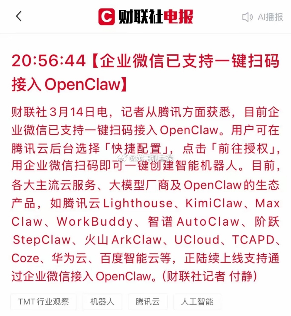 王炸!企业微信一键接入Open Claw!“龙虾”概念的新机会来了?腾讯再放大招!企业微信现已支持一键扫码接入OpenClaw(AI龙虾)。前阵子闲鱼安装“龙虾”要200~500不等,短短几天,安装就像扫码加好友一样简单,直接跑进打工人的工作流。腾讯这一手,堪称“降维打击”!不管你用的是腾讯云、华为云,还是用火山Ark、智谱、阶跃星辰的模型,只要在后台扫个码,一个24小时不用睡觉,能写纪要、拉数据、还能回信息的“助手”就配置好了。此消息与“龙虾全国免费装”的预期形成共振!以下三个方向有望受益:1.企业办公AI企业微信的庞大用户群为AI智能体提供了绝佳入口,能快速实现会议纪要、文档处理、数据查询等场景的自动化,降本增效显著。·汉得信息:已官宣集成OpenClaw,深耕企业ERP/财务场景,企业微信是其核心触达渠道,将直接承接企业AI办公改造需求。·泛微网络/致远互联:OA办公龙头,与企业微信深度打通,可快速推出AI审批、AI知识库等功能,提升产品付费率。·神州数码:腾讯云核心伙伴,助力OpenClaw在大型企业客户中的落地推广。·金山办公:WPS与企业微信深度协同,若结合OpenClaw实现文档的智能生成与分析,想象空间巨大。2.云服务与算力OpenClaw的普及将带来Token消耗的指数级增长。·优刻得:首批支持企业微信接入的云服务商,提供OpenClaw专属云主机。·常山北明:腾讯云最大政企业务代理商,政务与大型企业场景的OpenClaw推广核心载体。·世纪恒通:腾讯云生态服务商,在汽车、金融等垂直场景具备先发优势。·中贝通信:为阶跃星辰(StepClaw背后算力方)提供高性能算力集群。·浪潮信息/中科曙光:AI服务器龙头,企业级AI智能体大规模部署将持续拉动服务器采购需求。·深信服:企业云桌面及超融合架构提供商,若企业大规模普及AI办公,底层算力资源的云化改造需求随之而来。3. AI应用与安全智谱、阶跃星辰等大模型厂商及各类Claw生态产品接入,将繁荣整个AI应用生态。同时也带来了数据安全的新挑战。·科大讯飞:与腾讯云在AI领域有深度合作,星火大模型有望与各类Claw生态产生协同。·拓尔思:在政务、媒体等垂直领域有深厚数据积累,可作为OpenClaw的专业知识库提供方。·北信源/电科网安:OpenClaw权限过大引发市场对数据泄露的担忧,企业级安全防护需求迫在眉睫。龙虾AIA股市场股市第一线