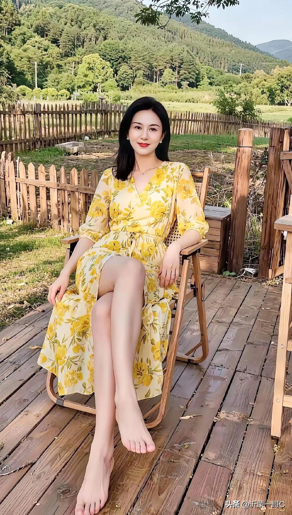 下面这位美女真的太美了!一袭黄色花格连衣裙显得高贵典雅,皮肤白净,瓜子脸,一头乌黑的长发披肩,修长的大腿,白净的小脚丫一点修饰也没有,纯真的自然美,坐在自己的小花园里呼吸着大自然的新鲜空气,美哉美哉啊!