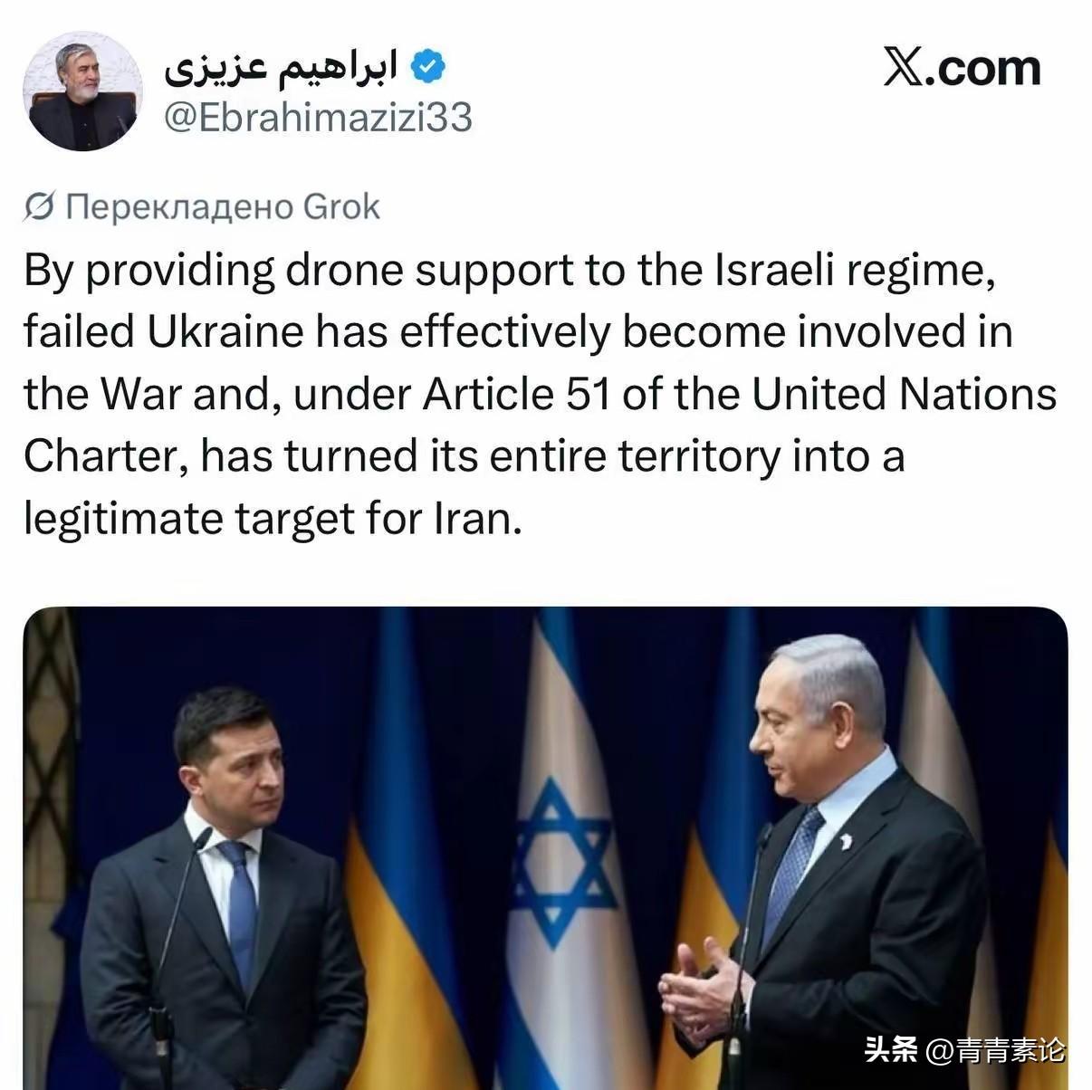 乌克兰要“求锤得锤”了。伊朗议会国家安全委员会主席易卜拉欣-阿齐兹表示,乌克兰给以色列政权提供无人机,乌克兰已经事实上卷入了伊朗同以色列的战争,根据联合国宪章51条,乌克兰此举已经是它可以成为伊朗的攻击目标。泽连斯基一直想开辟“第二战线”,伊朗也许会给他这个机会,让泽连斯基梦想成真!