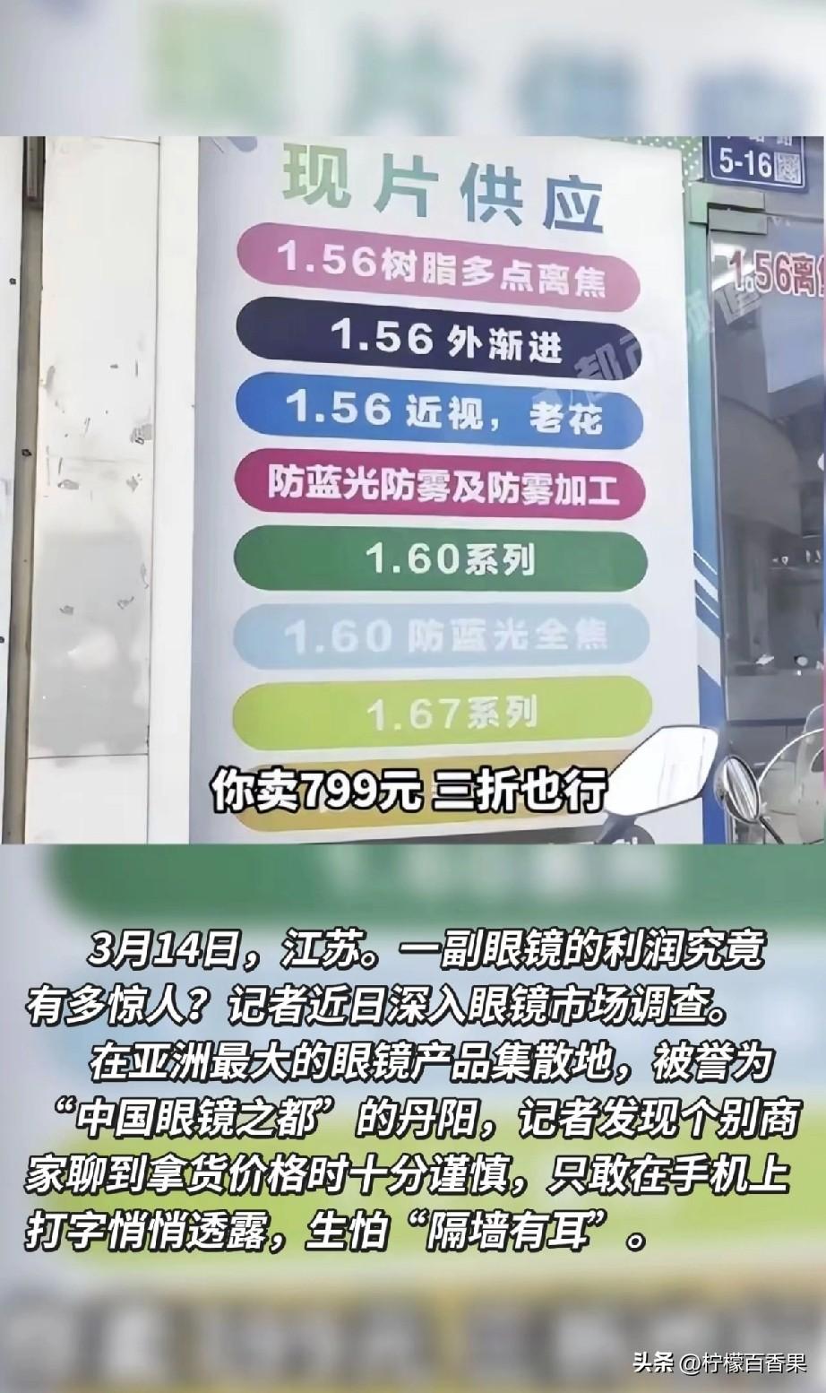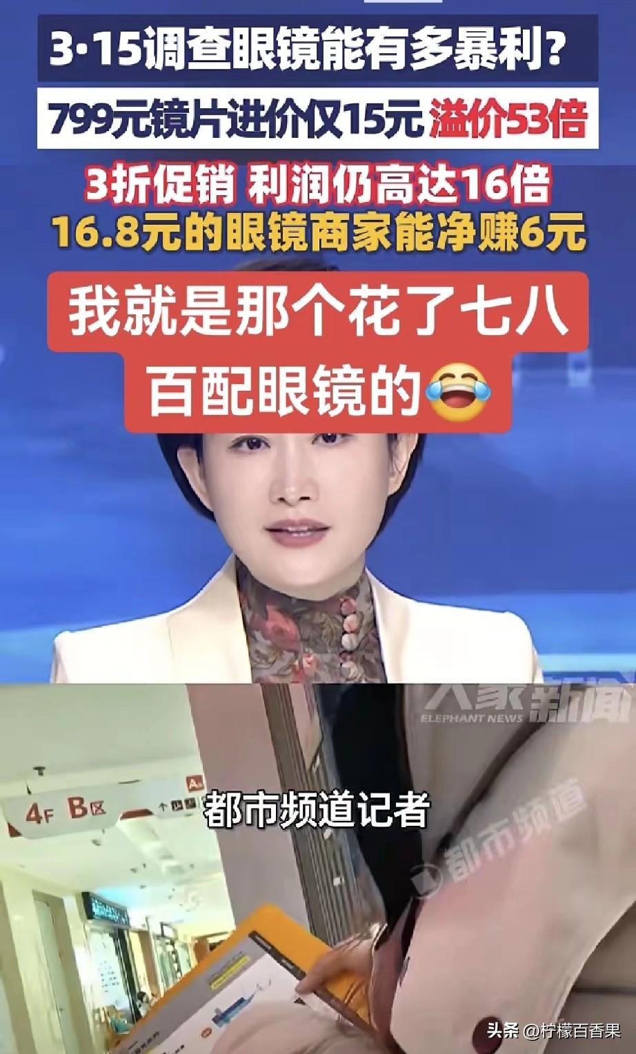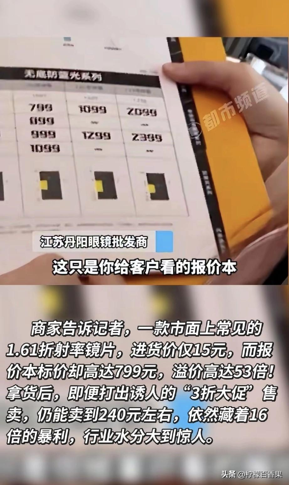 破防了!3·15曝光眼镜暴利,我花800配的眼镜,成本竟只有15块? 家人们谁懂啊!刚刷到3·15眼镜行业调查,直接给我整破防了!一款门店标价799元的镜片,进货价居然才15块,溢价直接干到53倍!就算打3折卖240块,商家还能赚16倍的利润,这钱也太好赚了吧! 更离谱的是,那些16.8元的低价配镜套餐,商家都能净赚6块钱!合着我们以为捡了便宜,其实人家早把利润算得明明白白。从工厂到门店,层层加价,最后买单的全是我们这些近视党。 我自己前阵子刚花七八百配了副眼镜,现在想想简直是交了智商税!明明成本几十块的东西,靠着“防蓝光”“进口材质”这些噱头,就能翻几十倍卖。说到底还是我们不懂行,被信息差狠狠拿捏了。 真心建议大家以后配镜别再被高价套路了!多问问折射率、阿贝数这些核心参数,别听店员瞎忽悠,能线上配镜就别去线下门店当冤大头!也希望监管部门能好好管管,别让这种暴利乱象继续坑害消费者! 快把这篇内容转发给身边戴眼镜的家人朋友,别让更多人被割韭菜!