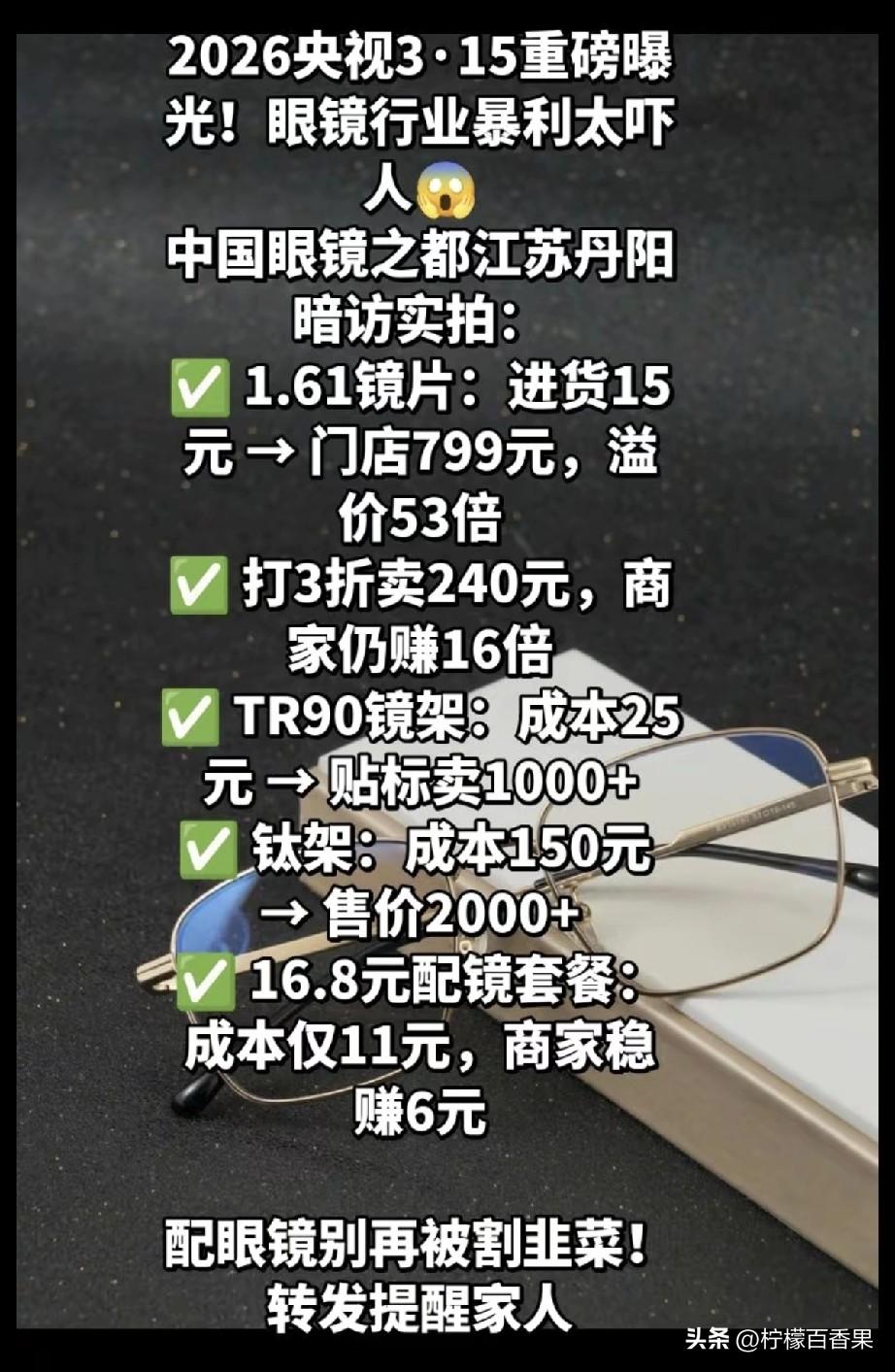 破防了!3·15曝光眼镜暴利,我花800配的眼镜,成本竟只有15块? 家人们谁