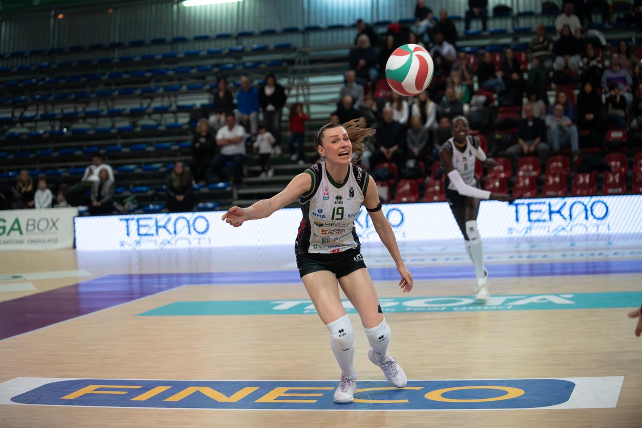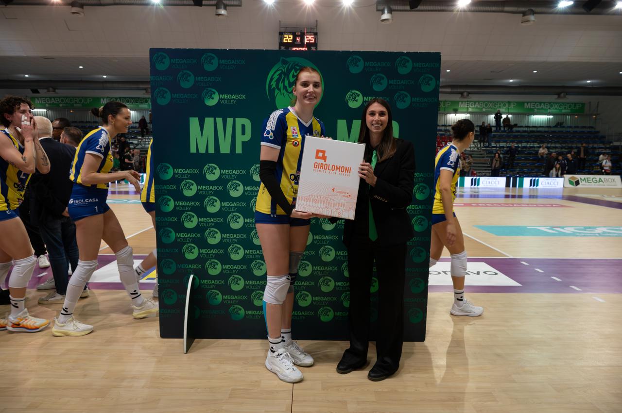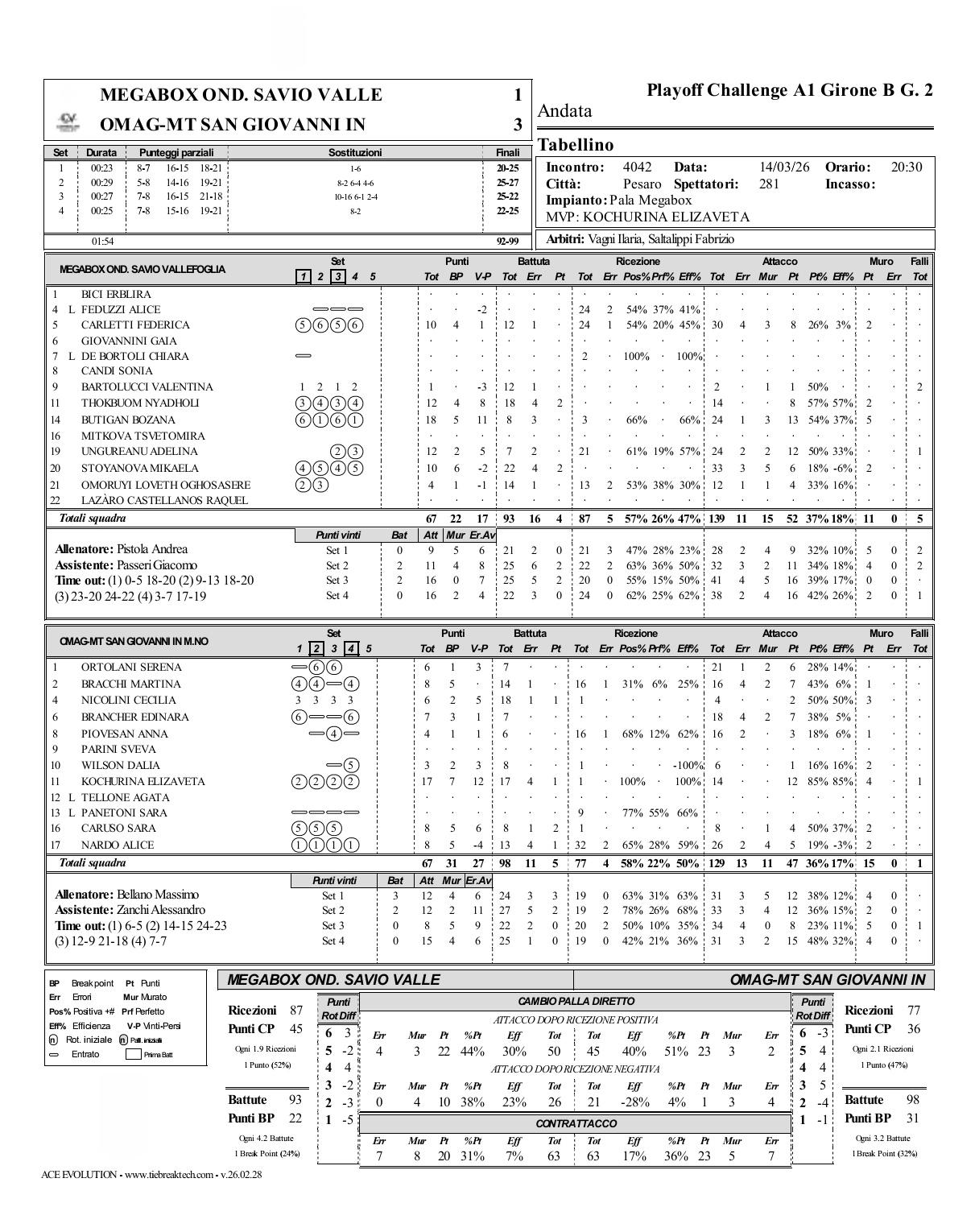 庄宇珊离队,圣乔瓦尼再创新高 2025-2026意甲女排季后赛挑战赛(欧挑杯附加赛)第二轮,B组的圣乔瓦尼在主二传德国外援斯特劳贝和庄宇珊相继离队、经历短暂震荡后,重整旗鼓、再创新高,在客场3-1挑落季后赛八强之一、在常规赛两次零封自己的瓦莱福利亚,四局比分25-20, 27-25, 22-25, 25-22,俄罗斯副攻科丘里那12扣4拦1发17分、85%&85%的进攻双率再次获得MVP。 瓦莱福利亚: 布蒂甘24扣13中1失3被拦、5拦0发18分 托克布姆14扣8中0失0被拦、2拦2发12分 翁古雷亚努24扣12中2失2被拦、0拦0发12分 卡莱蒂30扣8中4失3被拦、2拦0发10分 斯托亚诺娃33扣6中3失5被拦、2拦2发10分 奥默鲁伊12扣4中1失1被拦、0拦0发4分 巴特卢奇2扣1中0失1被拦、0拦0发1分 圣乔瓦尼: 科丘里那14扣12中0失0被拦、4拦1发17分 卡鲁索8扣4中0失1被拦、2拦2发8分 布拉奇16扣7中4失2被拦、1拦0发8分 纳尔多26扣5中2失4被拦、2拦1发8分 布兰彻尔18扣7中4失2被拦、0拦0发7分 尼科利尼4扣2中0失0被拦、3拦1发6分 奥托拉尼21扣6中1失2被拦、0拦0发6分 皮奥维桑16扣3中2失0被拦、1拦0发4分 威尔逊6扣1中0失0被拦场、2拦0发3分 瓦莱福利亚-圣乔瓦尼: 进攻得分:52-47 拦网得分:11-15 发球得分:4-5 对方送分:25-32 总得分:92-99 一传到位率:57%-58% 一传完美率:26%-22%