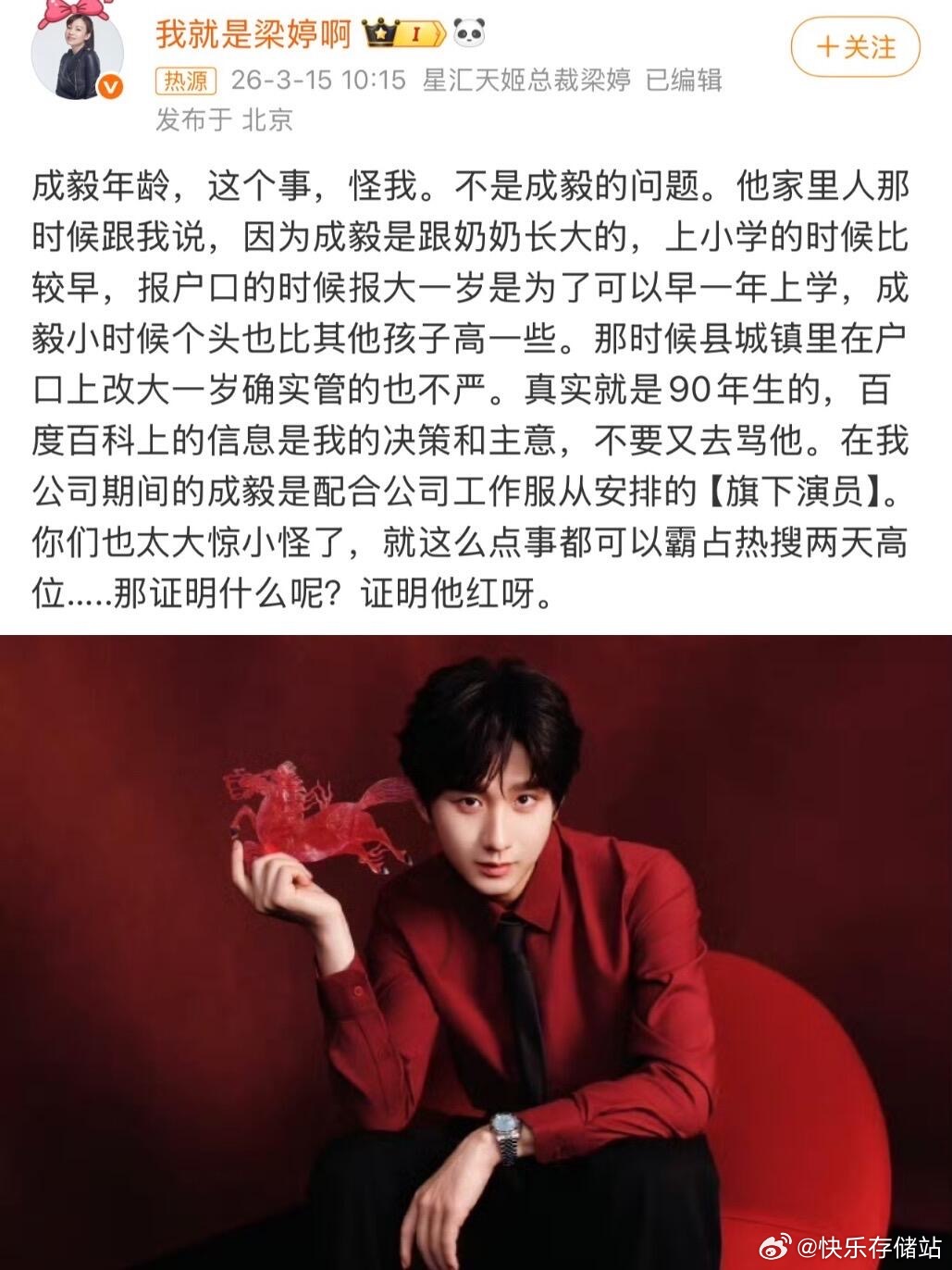 成毅 年龄梁婷:成毅年龄这个事怪我|||不是什么大事以前为了读书把年纪改大是很常见真实就是90年的啦