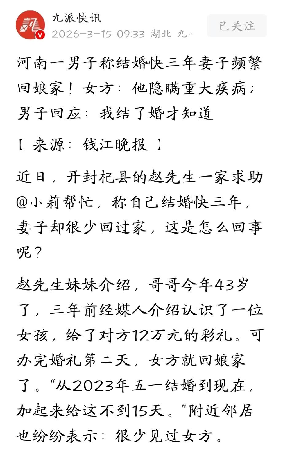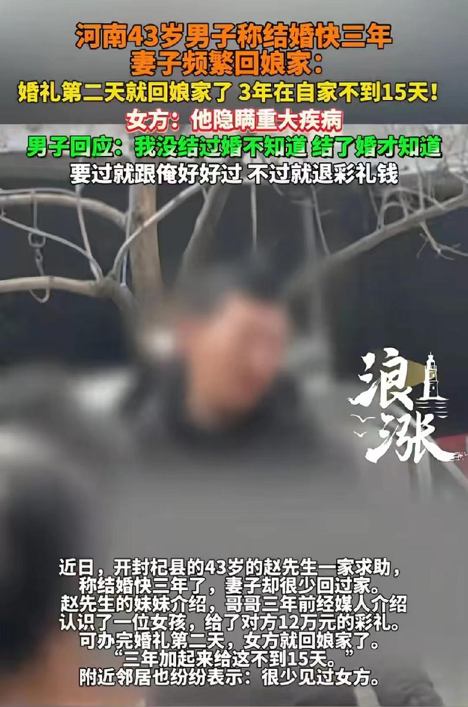 河南开封,男子40岁时,才经媒人介绍认识了女子,很快,便花12万彩礼把对方娶回了家。谁知,婚后第二天一大早,女子便收拾东西气冲冲的回了娘家,之后三年,回来不超过半个月。男子花钱娶了个寂寞,既然她不想踏实过日子,他要求女方退还彩礼。谁知,女子委屈表示∶他隐瞒了重大疾病。对此,男子解释∶我没结过婚,新婚当晚才知道的,不存在隐瞒。双方各执一词,准备走法律途径。 赵先生今年43岁,前几年才靠媒人介绍,认识了现在的妻子,两人见面聊了几次,都觉得对方人不错,很快订了婚。 按照当地的老规矩,赵家给了女方12万彩礼,风风光光办了婚礼。 洞房花烛夜,赵先生满是期待,可没想到出了意外,他发现自己那方面不太行。 赵先生又羞愧又无措,他是头婚,以前从来没经历过这种事,根本不知道自己身体有问题,想着可能太紧张,过段时间可能就好了。 结果第二天一早,妻子就收拾好东西回了娘家。 赵先生觉得是头天晚上自己没表现好,惹媳妇生气闹别扭了,想着等她气消了就会回来,也没敢多问。 谁能想到,妻子这一走就再也没怎么回来过。 赵先生的妹妹每次跟人说起这事就叹气,从2023年五一结婚到现在,快三年了,嫂子加起来在家住的不到15天。 周围的邻居也纷纷点头,说平时很少看见这家的新媳妇,偶尔回来一趟,待不了几个小时就急匆匆走了,跟这个家就像没啥关系似的。 赵先生的母亲急得天天抹眼泪,拉着儿子问到底出了啥事。 赵先生也说不清楚,只能硬着头皮解释,可能是媳妇脾气倔,俩人性格合不来。 可他自己心里苦啊,12万彩礼花出去了,热热闹闹娶了媳妇,结果守着空屋子过了快三年,好好的日子愣是过成了笑话。 赵先生心里越来越憋屈,实在是没办法了,找了记者过来,想让记者帮忙说道说道 。他就俩想法:要是媳妇愿意回来,俩人就好好过日子;要是她不回来了,那就把彩礼退回来,不能就这么稀里糊涂算了。 记者联系上女方家里,女方的哥哥一听赵先生的诉求,火气一下子就上来了,直接说男方隐瞒重大疾病,这事他自己心里清楚。 记者转头问赵先生,赵先生愣了一下,也没藏着掖着,承认自己确实有这方面的毛病,但他也是新婚夜才知道的,之前自己压根没往这方面想,更不是故意隐瞒。 没过多久,赵先生的妻子给记者发来了一段录音,是2023年7月份俩人打电话的录音。 录音里,赵先生说∶咱俩离婚吧,下了班连个饭都不做。这话听着像是已经对这段婚姻没什么期待了。 提起这段婚姻,赵先生的妻子也是一肚子委屈,她说自己嫁过去是想好好过日子的,可这算什么,这不是守活寡吗? 自己实在没法跟赵先生过下去了,至于最后怎么解决,她打算走法律程序,法院怎么判她就怎么认。 婚前检查真的不是走过场,它关乎两个人一辈子的幸福。 如果当初做了检查,男方能早点儿了解自己的身体状况,女方也能在婚前就知道真实情况,大家把话说在明处,能接受就结婚,不能接受就别耽误彼此,哪至于走到今天这一步? 还有一点很重要,就是要坦诚。结婚是过日子,不是演戏,有病不可怕,可怕的是婚后才发现自己被骗。 依据《民法典》第一千零五十三条:一方患有重大疾病的,应当在结婚登记前如实告知另一方;不如实告知的,另一方可以向人民法院请求撤销婚姻。 男方以女方隐瞒重大疾病为由,或女方以男方隐瞒病情为由,均需先认定疾病是否属于“重大疾病” 。 若男方性功能障碍未被医学认定为重大疾病,或双方均无充分证据证明对方婚前明知且故意隐瞒,法院难以认定构成隐瞒重大疾病。 但是,《关于适用〈民法典〉婚姻家庭编的解释(一)》第五条规定:当事人请求返还按照习俗给付的彩礼的,如果查明属于以下情形,人民法院应当予以支持:(一)双方未办理结婚登记手续;(二)双方办理结婚登记手续但确未共同生活。 赵先生与妻子已办理结婚登记,但婚后共同生活时间极短,三年累计不足15天,婚姻实质目的未实现,赵先生主张返还彩礼,通常会得到法院支持。 司法实践中,法院会结合彩礼数额、共同生活时长、双方过错及当地习俗,酌情确定返还比例,一般倾向于支持较高比例的返还。