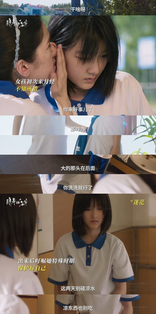 国产剧月经戏终于不尴尬了 任小名第一次来月经手足无措,闺蜜立马围上衣服教她用卫生巾,还自然地提醒别碰凉水。回家后妈妈看到带血衣物也没大惊小怪,只是温柔教她怎么清洗。没有刻意煽情,只有女生之间最真实的善意与陪伴,这才是国产剧该有的样子!隐身的名字