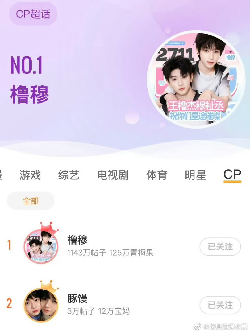 我去 橹穆和豚馒拿下了cp榜单前两名 博君一肖已不在前排橹穆