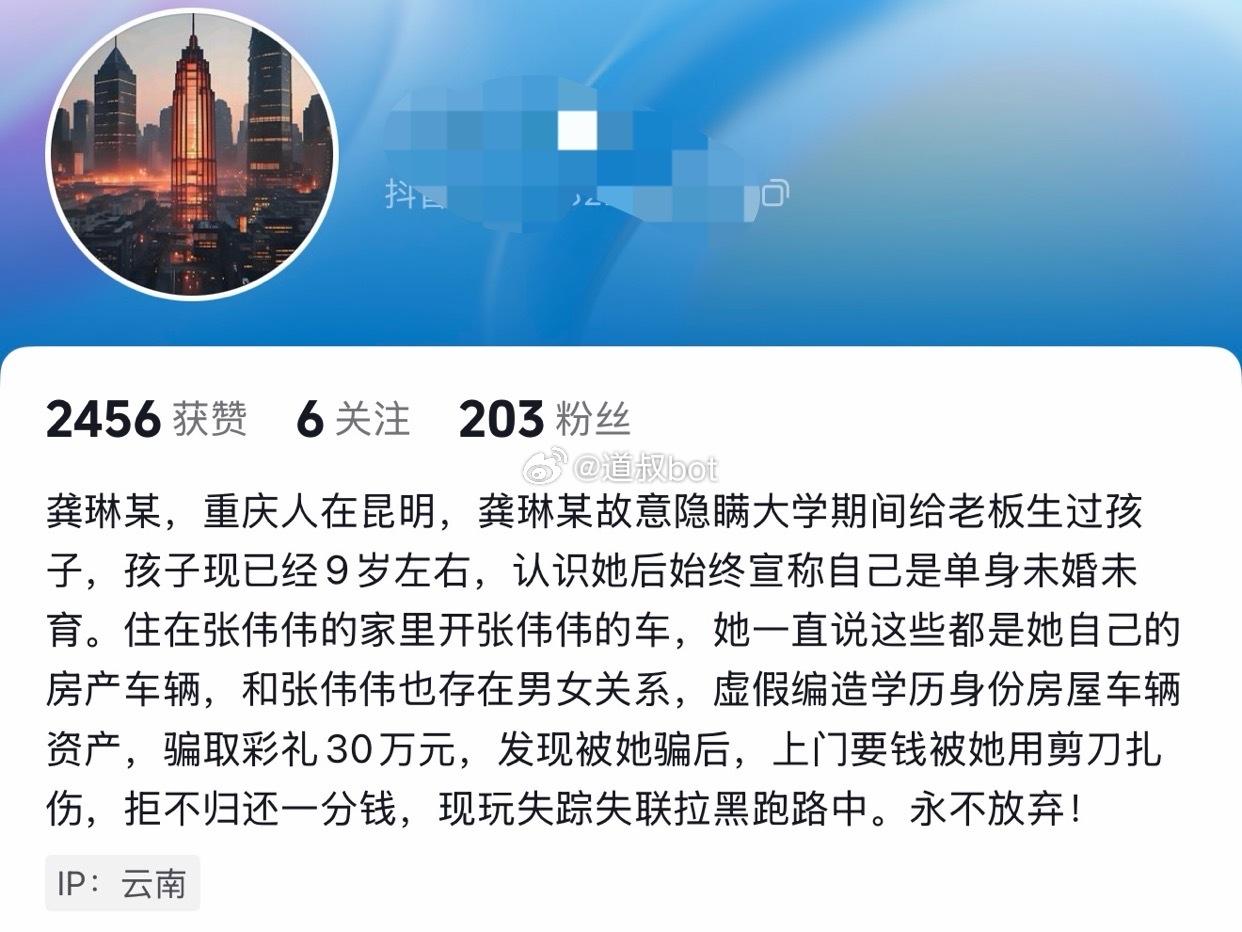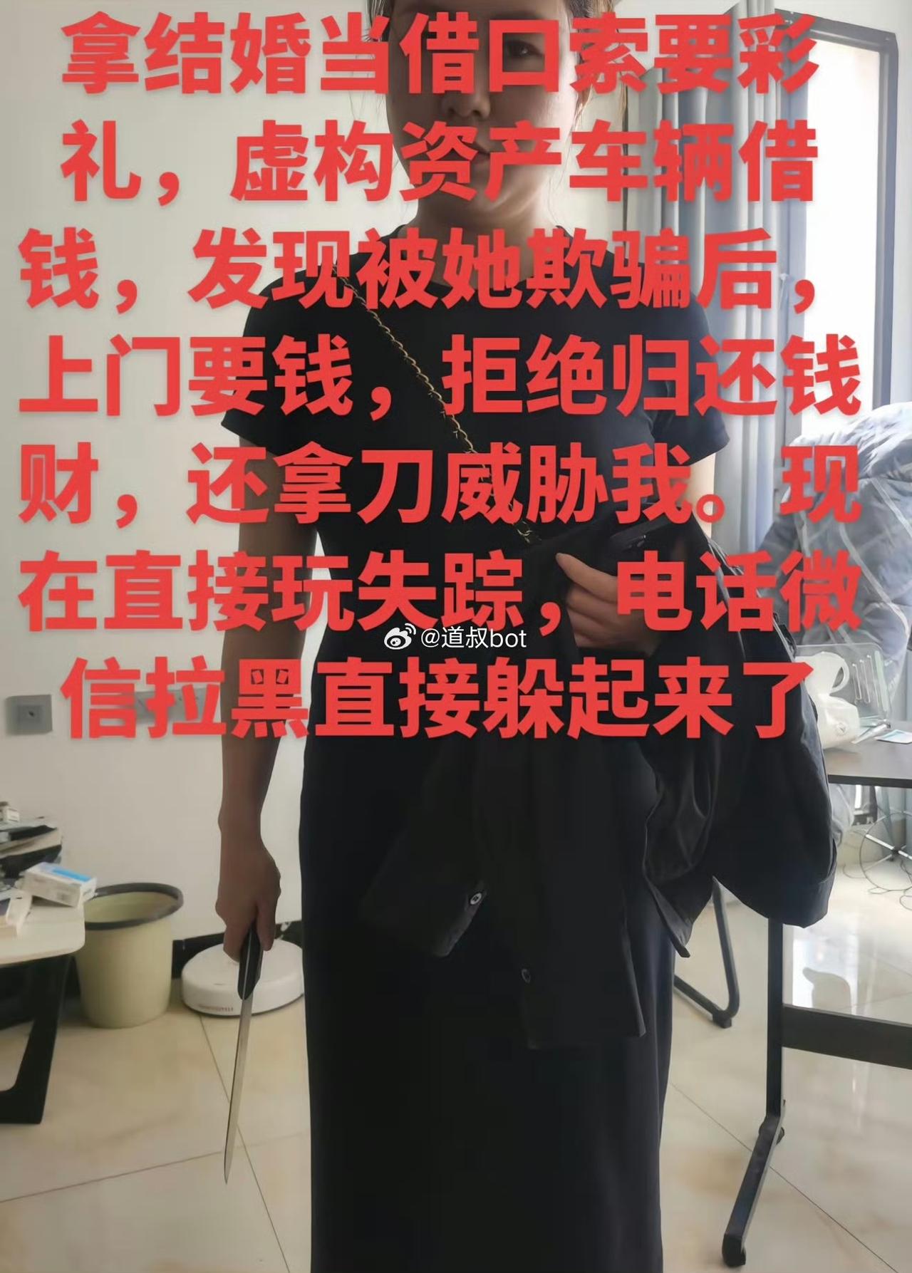 又一个大冤种,男子被重庆女子骗婚 30 万拉黑跑路了。这名女子姓龚,重庆人,在昆明发展,大学期间和人生了一个小孩,已经 9 岁。和该名男子交往时,同时有一个同居的男友张某,住着张某的房子,开着张某的车。对男方谎称有车有房,让男子信以为真。见女方温柔体贴漂亮,男子着急忙慌给了女子 30 万作为结婚的彩礼。后面男子发现了真相,想要回彩礼。上门遭遇女子持刀威胁,之后女子拉黑他所有的联系方式失联了。男子根据女子身份证的地址信息找到她家,却人去楼空。现在男子报警了,警察也立案。男子觉得如果钱要不回来,就一定要把这个骗婚的女子送进去反省。