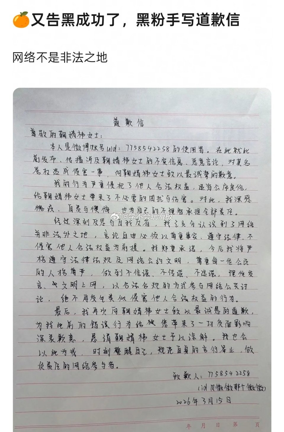 鞠婧祎告黑成功,黑粉手写道歉信道歉。