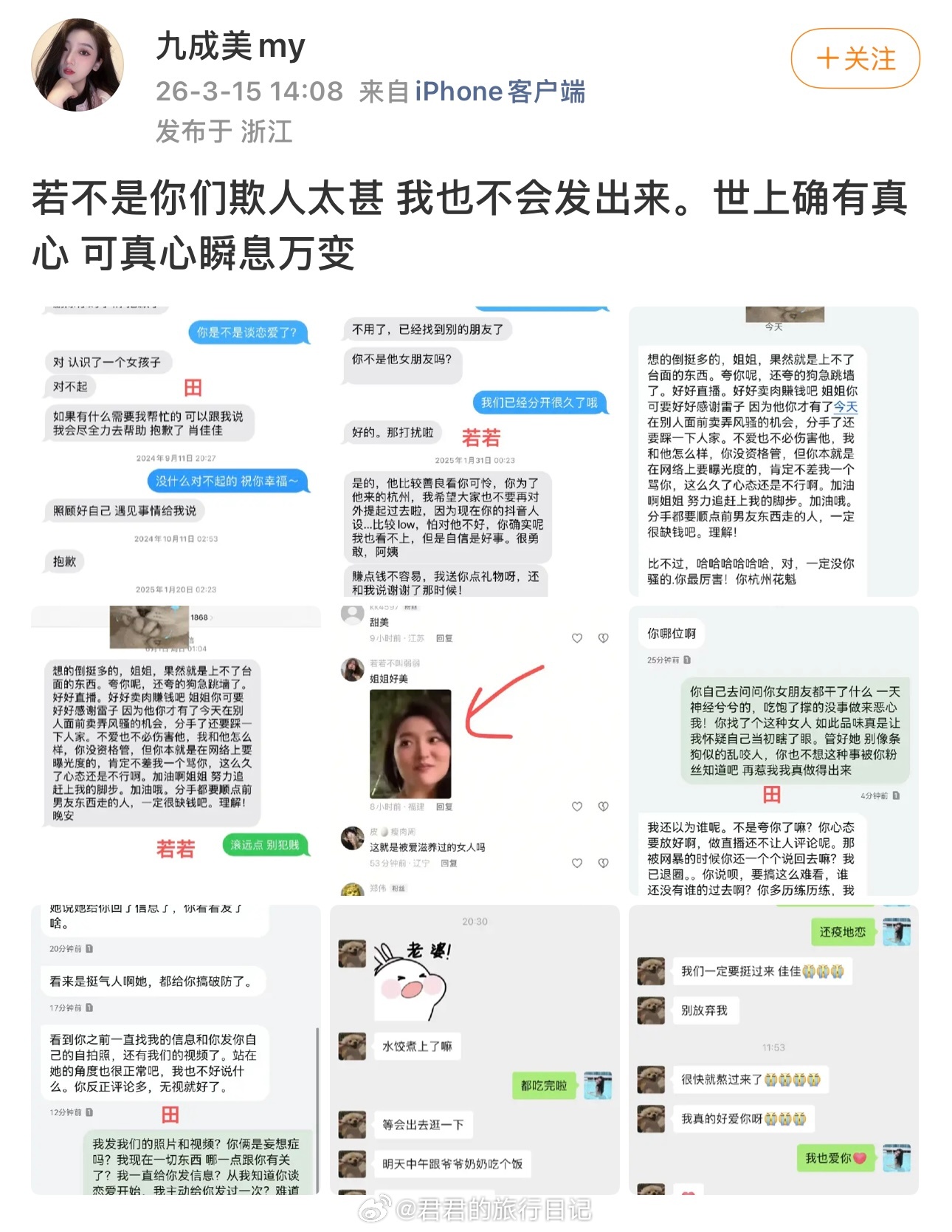 后面几张图,是网传的现女友若若不停发微信,骚扰和辱骂九成美···