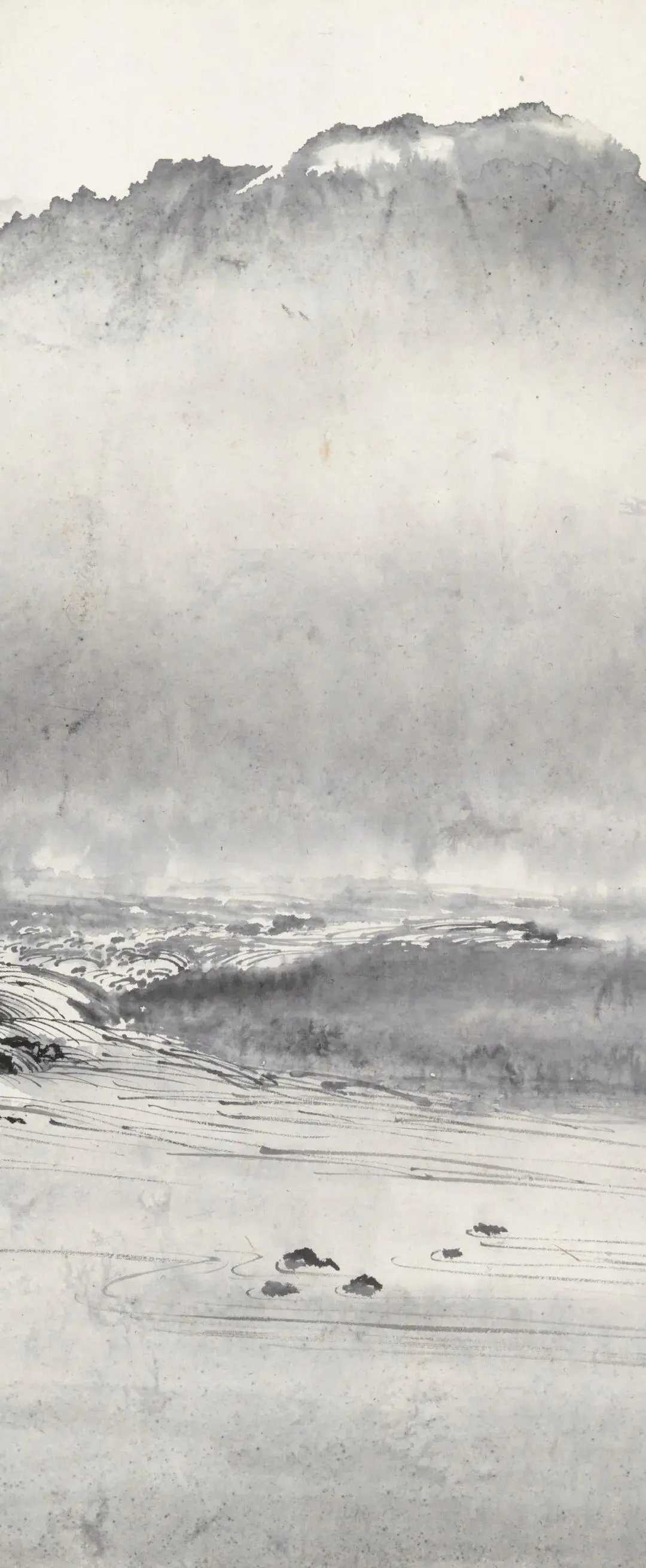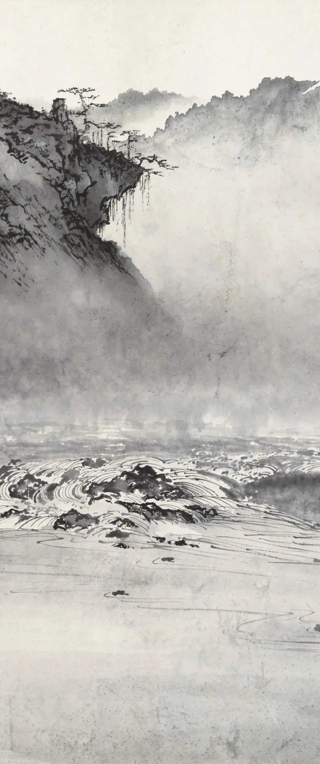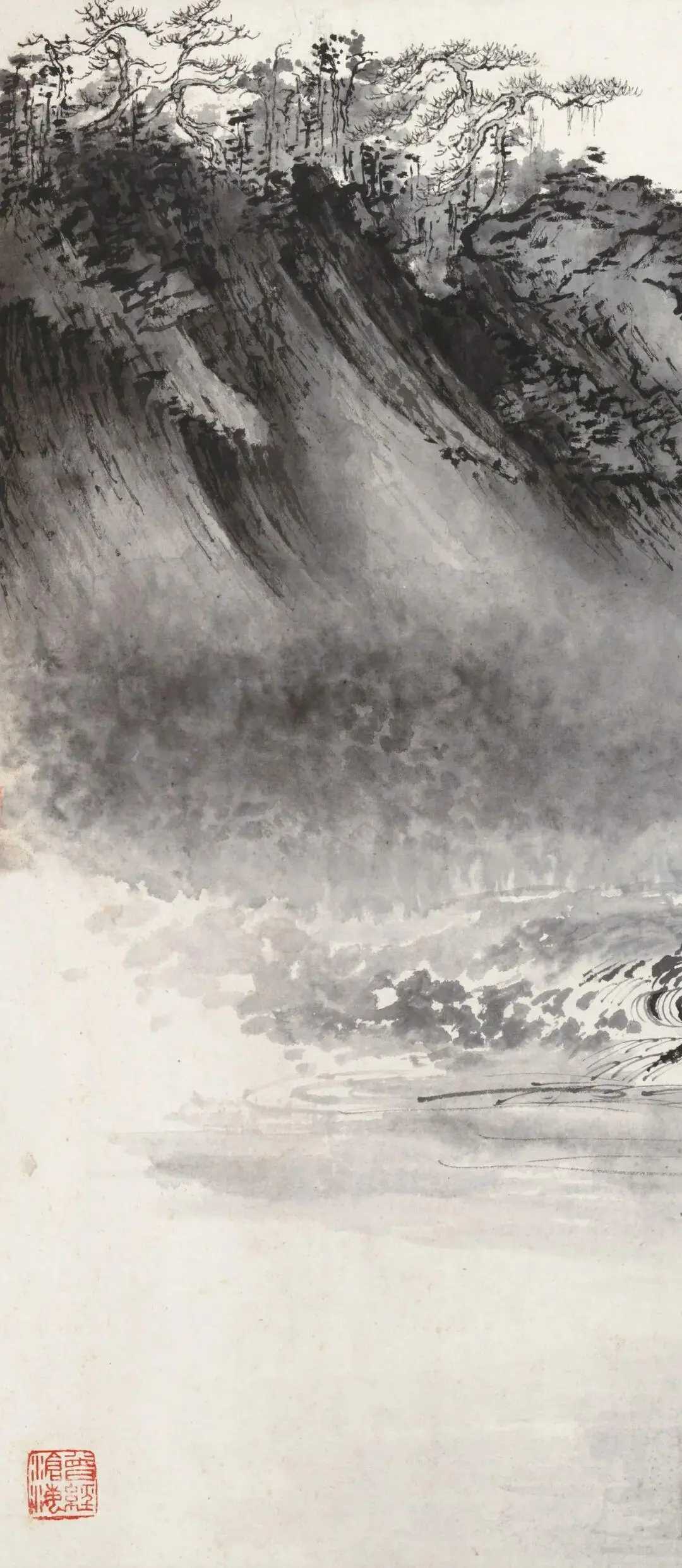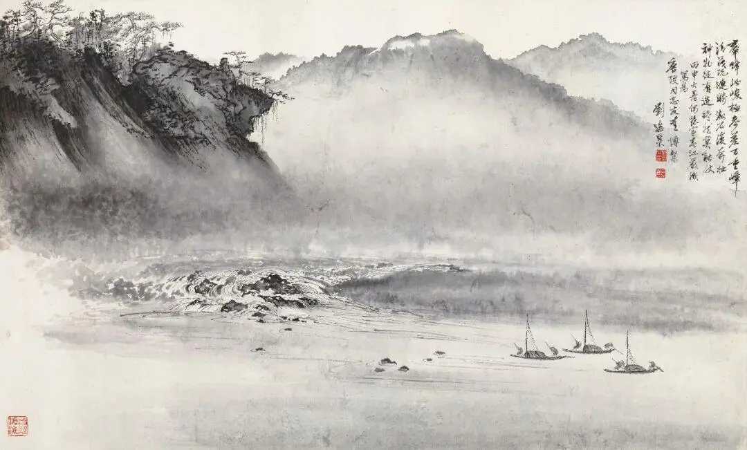 刘海粟《富春江图》,水墨纸本 67.5×111cm。钤印:海粟长寿、武进刘氏。款识:群峰此峻极,参差百重嶂。清浅既涟漪,激石复奔壮。神物徒有造,终然莫能仗。丙申大暑,偶忆富春江严濑。写为唐弢同志友爱博粲。刘海粟。这就是中国风遇见艺术