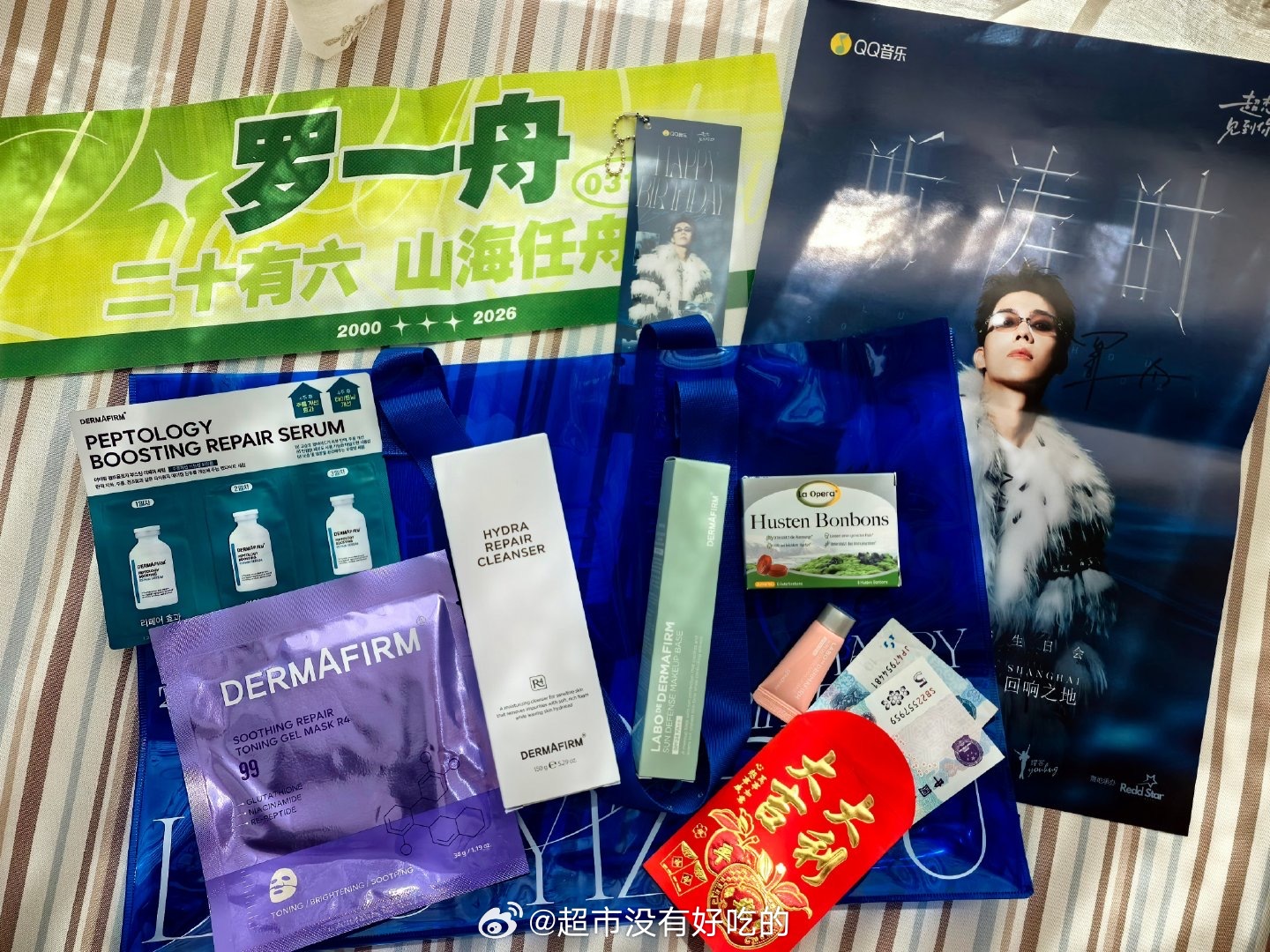 罗一舟昨天上海生日会给现场的伴手礼好大方票价分580/880,伴手礼都是一样的,包括一个品牌正装洁面、正装隔离、一片面膜、三片精华小样、一支隔离小样、一盒润喉糖,还有每人15块钱的现金利是红包罗一舟罗一舟