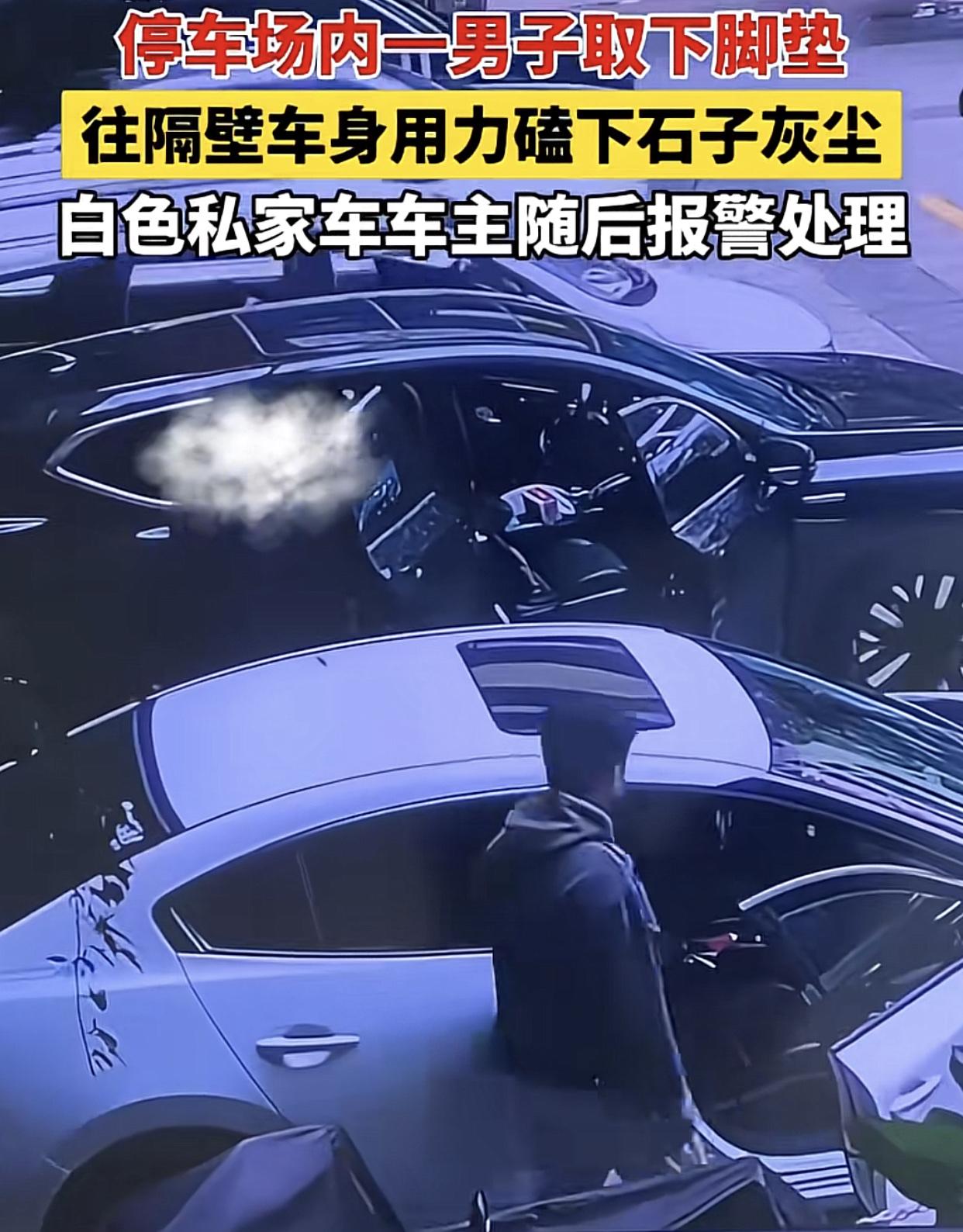 广东一停车场,一辆黑色小车车主下车后,从车上下来拿起驾驶座满是沙土和灰尘的踏板胶,二话不说直接就往停在旁边的白色小车车身猛拍,这一幕刚好被还在车上的车主发现,于是双方吵了起来,未果!白车车主只有报警。 这种事又构不成刑事毁坏寻衅滋事,顶多让白车赔偿2-3百元洗车费,普通车要100元冼车费,好让他长长记性。幸亏白车有人,不然吃哑巴亏了。 遇上这种缺德玩意儿别跟他啰嗦,直接报警!上次一名同住小区车主,地下车库停好车后,对着旁边我的车后轮嗞嗞一大泡尿。早上去取车就闻到一股浓浓的尿骚味,一看一堆尿渍还在车后轮,马上跑去物业查监控,找到人后报警。叔叔说不够成寻衅滋事,最后就赔了个洗车费。 作为一名老司机提醒各位,停车场停车一定要停在监控范围内,最好是跟豪车旁边停。