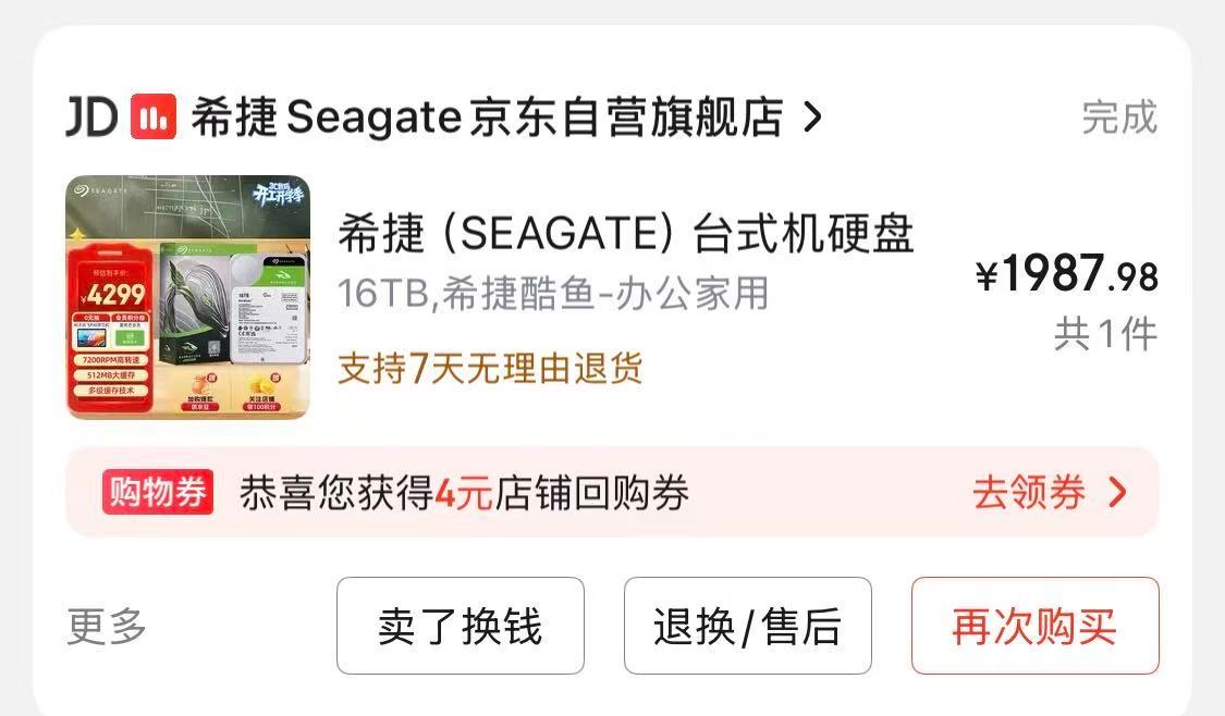 去年最成功的投资是三块16TB硬盘放在nas里买的时候单价1999 现在4277增长率超过我所有的大A和基金