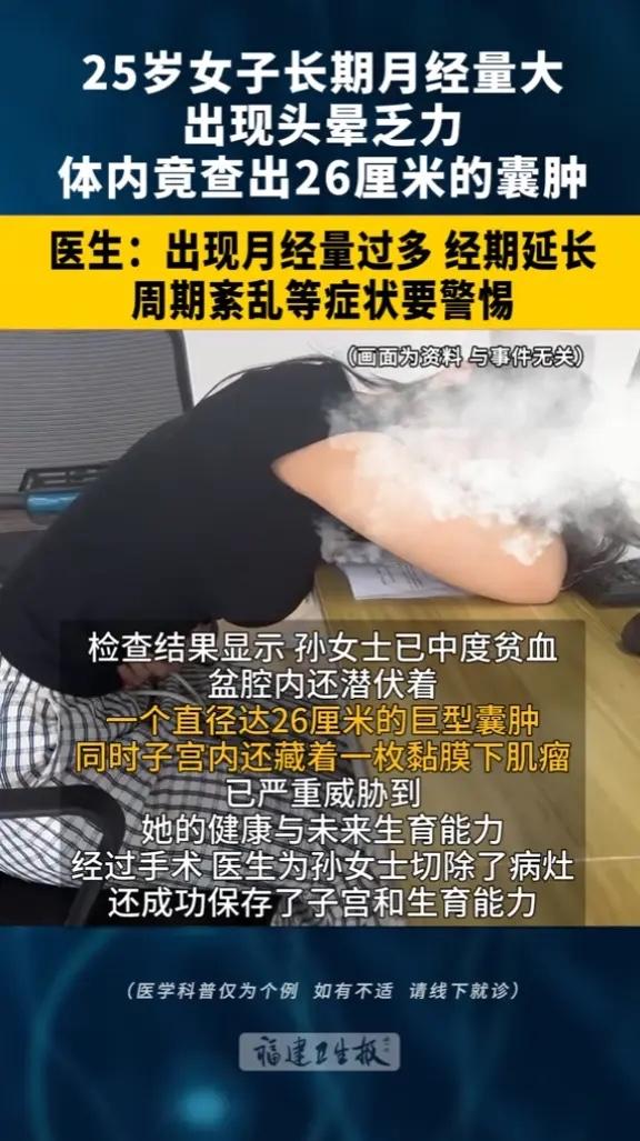 “悲剧还是发生了!”近日,湖北武汉,一女子长期月经量大,并且经期延长不止,最近,她甚至出现了乏力头晕不适的症状,去医院检查后,才发现女子已经中度贫血,并且盆腔内还藏着一个巨型包块,同时子宫内还藏着一枚黏膜下肌瘤!网友:万万没想到! 这位女士姓孙,今年25岁,在武汉工作。她这情况其实拖了挺久了。每次来月经,量都特别大,日子也拉得老长,十天半个月都干净不了。时间一长,她总感觉身上没劲,爬个楼梯都心慌气短,嘴唇也没什么血色。 她一直没太当回事,觉得可能就是累的,或者体质有点虚,自己买点补血的东西吃吃就行。直到今年三月初,她在办公室突然眼前一黑,头晕得站不住,这才被同事紧急送到了武汉市中心医院杨春湖院区。 检查结果显示血红蛋白已经很低了,属于是中度贫血了。医生还给她做了B超,发现盆腔里有一个直径26厘米的巨大包块,子宫里还长着一个黏膜下肌瘤,两个问题碰到了一起。 医生说那个黏膜下肌瘤长在子宫腔里面,会让子宫内膜的面积变大,影响子宫正常收缩,血就会止不住地流。身体里的铁元素随着血液一点点流失,人可不就越来越虚,贫血越来越重嘛。 孙女士还算幸运发现得不算太晚,医生考虑到她还年轻,以后还要生小孩,给她做了微创手术。在肚脐那里开了一个小口子,把那个巨大的盆腔包块和子宫里的肌瘤都拿掉了。手术很成功,肚子上几乎看不出疤,以后也不影响怀孕。 月经量多、时间长、周期乱,这些都不是小事,更不是一句“内分泌失调”就能糊弄过去的。这很可能是身体在给你警报,告诉你子宫里可能长了东西,比如肌瘤或者息肉。 很多女性总觉得忍一忍就过去了,觉得月经量大是在“排毒”,这是个很大的误区。硬扛的结果,就是像孙女士这样,把轻度的不适拖成中重度贫血,把一个小问题拖到需要手术解决的大麻烦。 定期做个妇科B超检查,非常简单,却能早早发现盆腔里那些悄悄长大的“不速之客”。现在医学这么发达,很多问题通过微创手术就能解决,恢复快,伤害也小。 别再把月经异常当成羞于启齿或者无关紧要的事了。关心自己的身体,从重视每个月的那几天开始。 各位读者你们怎么看?欢迎在评论区讨论。