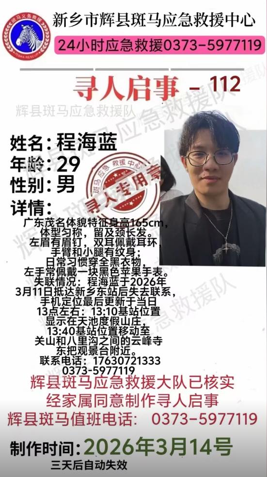广东茂名一 29 岁男子徒步南太行山。失联 4 天,至今联系不上。男子名叫程海蓝,身高 1.65 米,3 月 11 日他从广州坐飞机到河南,3 月 11 日中午到达河南新乡。下午 1 点钟左右开始徒步,在南太行山八里沟云峰寺附近出现,之后就失联了。南太行山是最近几年一个徒步爱好者的热门打卡地,拥有众多未开发的徒步路线,受到各路徒步爱好者的喜欢。但是因为山高路险,时常出现意外,已经出现多起徒步爱好者遇难的事件。目前家属联系了新乡附近的救援队,他们开始上山进行地毯式搜索,希望能有好消息。