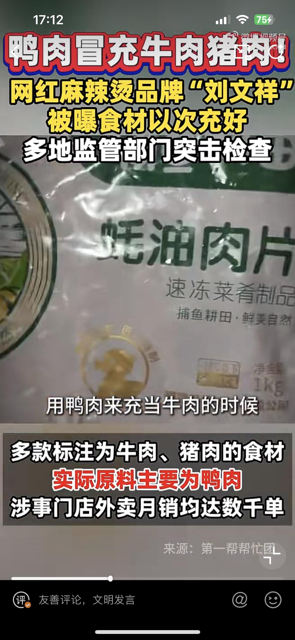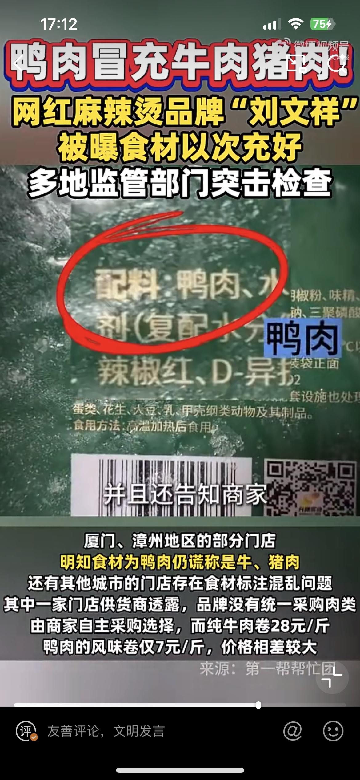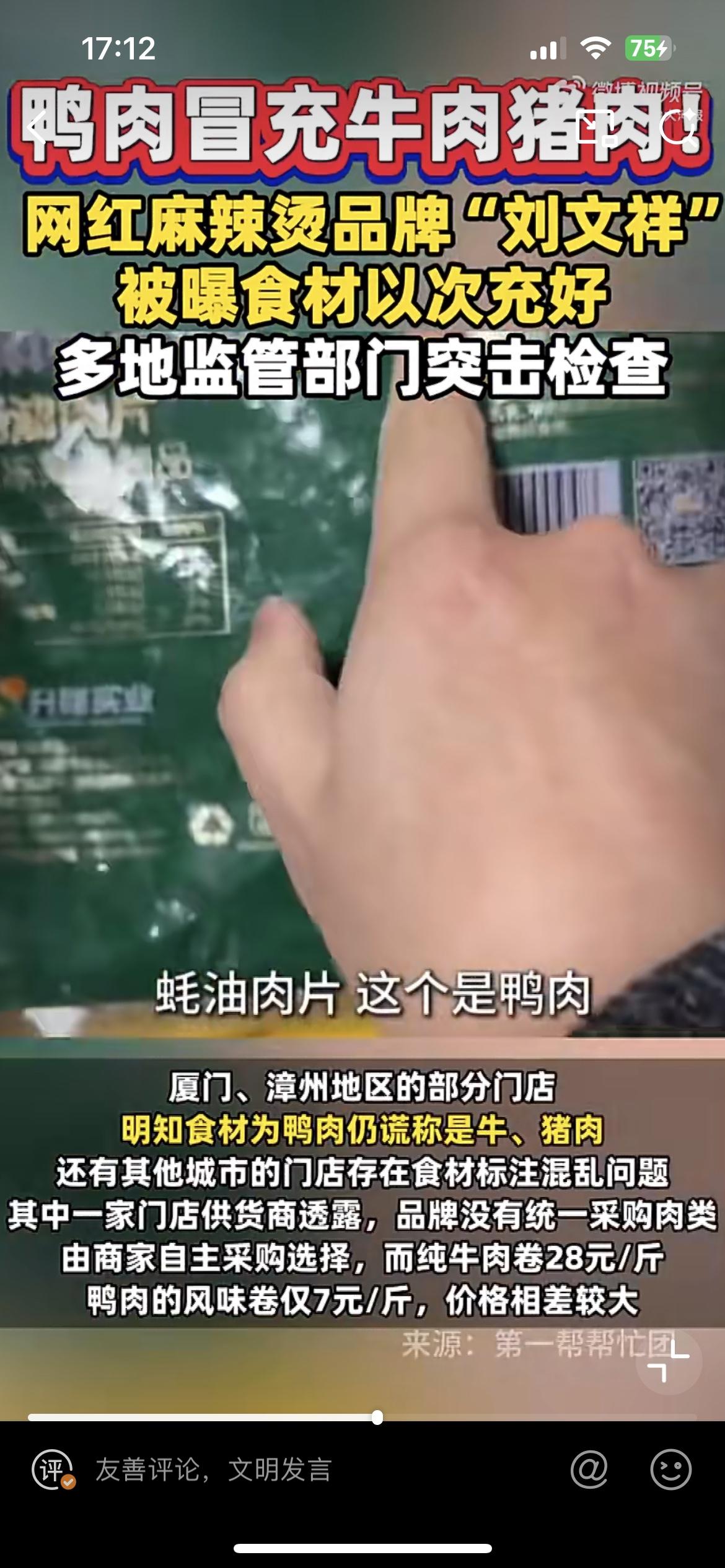 刘文祥麻辣烫被指鸭肉充猪肉牛肉卖,店员坦诚牛肉都是三四十块钱一斤,我们才卖 20 多,怎么可能是真牛肉?外面的各种几十元的小火锅、自助烤肉等等,只怕都是各种鸭肉冒充牛肉羊肉,否则就像这位店员说的,成本上根本做不过来。刘文祥麻辣烫作为最近爆火的餐饮品牌,在食材品质上做的相当敷衍。面对成本压力又要满足食客的喜好,只能以次充好用各种廉价的鸭肉去替代。