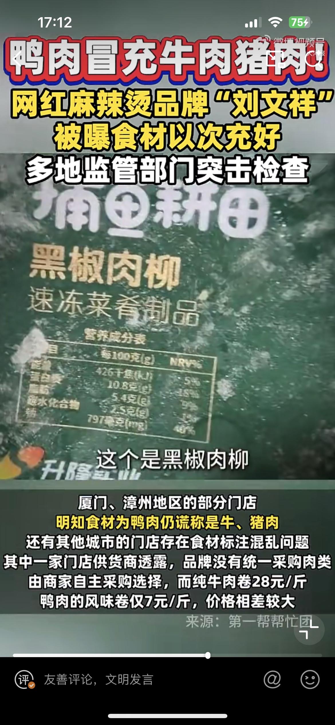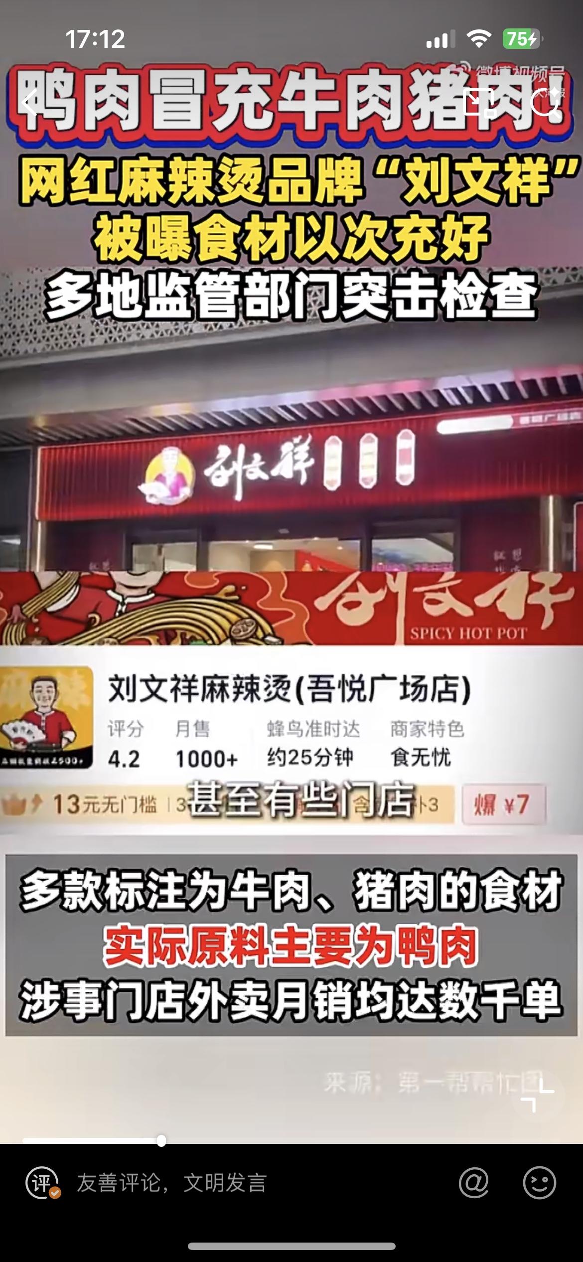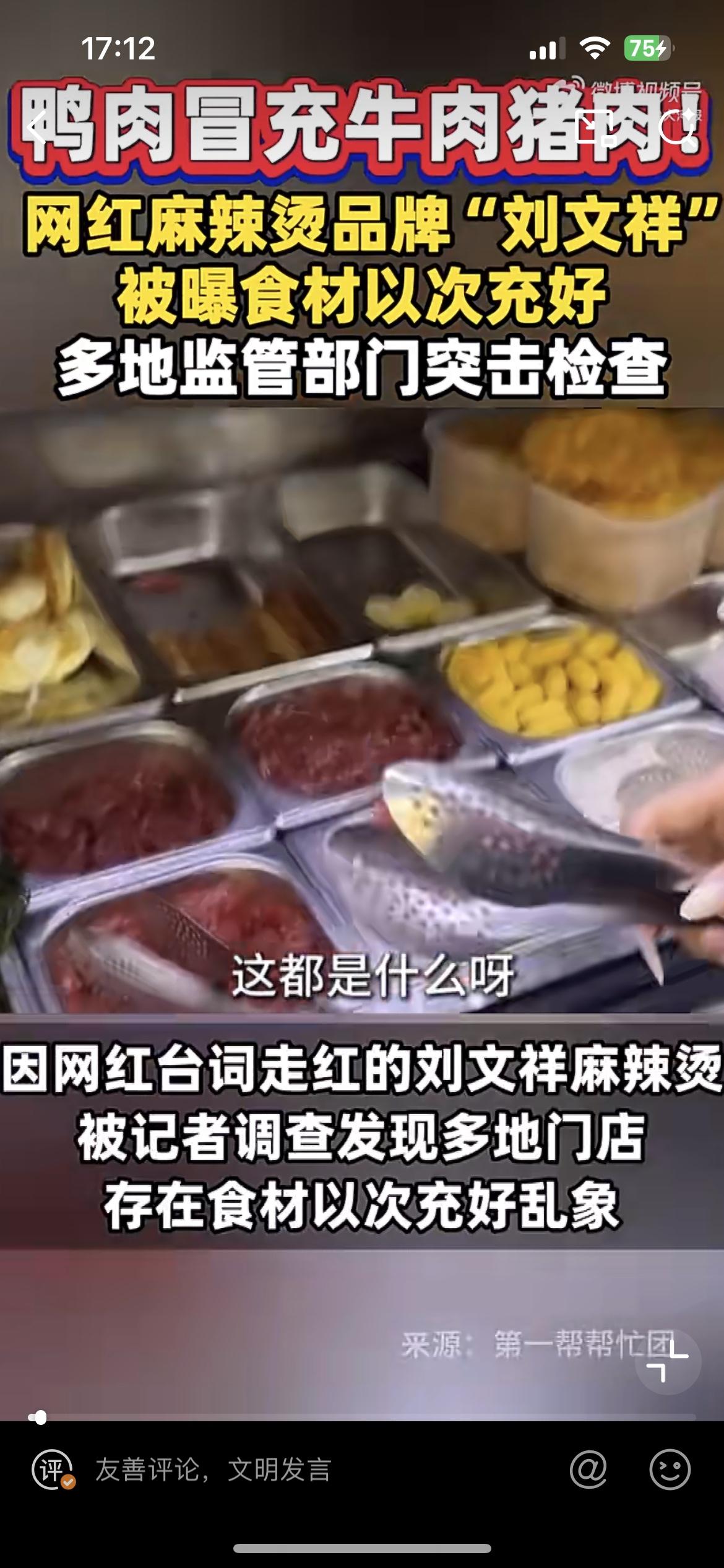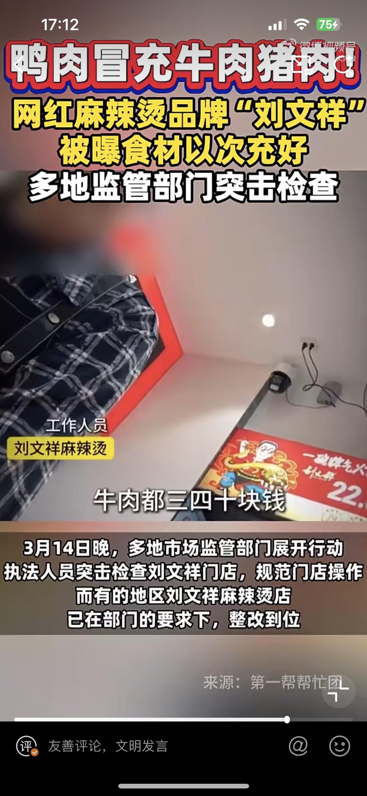 刘文祥麻辣烫被指鸭肉充猪肉牛肉卖,店员坦诚牛肉都是三四十块钱一斤,我们才卖 20 多,怎么可能是真牛肉?外面的各种几十元的小火锅、自助烤肉等等,只怕都是各种鸭肉冒充牛肉羊肉,否则就像这位店员说的,成本上根本做不过来。刘文祥麻辣烫作为最近爆火的餐饮品牌,在食材品质上做的相当敷衍。面对成本压力又要满足食客的喜好,只能以次充好用各种廉价的鸭肉去替代。