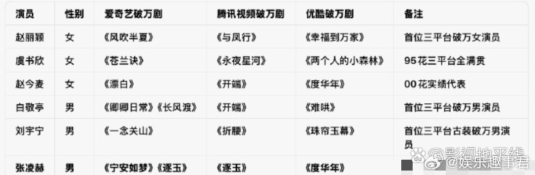 随着张凌赫主演的《逐玉》双平台破万成就的达成,他也成了目前内娱第六位达成三平台破万的演员。