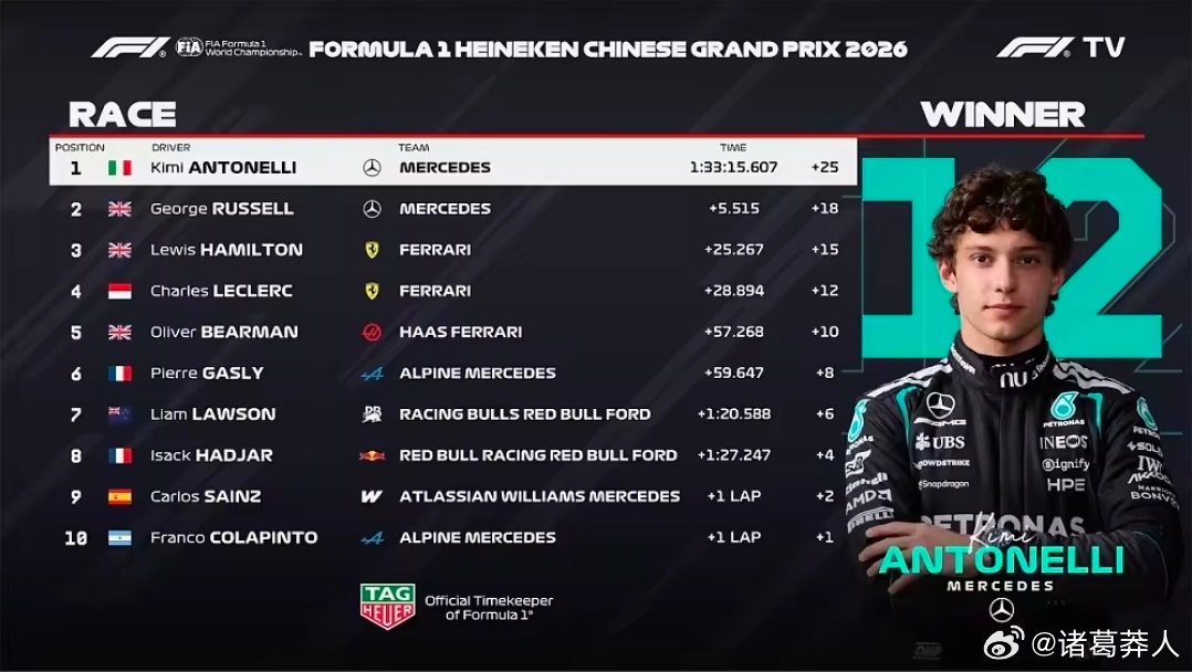 F1中国站:19岁梅奔小将安东内利杆位夺冠,生涯首冠入账2026赛季F1中国大奖赛正赛今日15:00在上海国际赛车场打响,19岁梅奔车手安东内利杆位起跑拿下生涯首冠,梅奔一二带回,法拉利双车内斗分获三、四名。赛前阿尔本、博托莱托、皮亚斯特里、诺里斯因赛车故障退赛,未上赛道;斯托尔、阿隆索、维斯塔潘赛中退赛。上海赛道全长5.41公里,“上”字形布局,正赛56圈,总里程约305公里。昨日排位赛,梅奔双车头排,安东内利杆位,拉塞尔第二,汉密尔顿第三。赛前迈凯伦诺里斯电气故障、皮亚斯特里暖胎圈前退赛;维斯塔潘赛前20分钟尾翼支柱故障,红牛紧急更换;阿尔本、博托莱托故障退赛。发车汉密尔顿一号弯超梅奔双车,维斯塔潘列第14,安东内利守第二;首圈哈贾尔与贝尔曼争夺打滑爆胎,进站换胎落队尾。第3圈安东内利发夹弯前直道超汉密尔顿,拉塞尔一号弯超勒克莱尔至第三;第5圈维斯塔潘升至第10,1号弯走线失误未超林德布拉德。第6圈维斯塔潘被要求软胎冲名次,却称轮胎已废;第8圈勒克莱尔追近汉密尔顿,汉密尔顿抱怨动力;第9圈贝尔曼超维斯塔潘,后者进站换胎。第10圈斯托尔退赛引安全车;第14圈安全车结束,科拉平托第二,奥康第三,拉塞尔被法拉利双车超越。第20圈维斯塔潘借缠斗超加斯利,被举报未被调查;第27圈法拉利内斗,拉塞尔超汉密尔顿,第30圈发夹弯超勒克莱尔至第二,安东内利拉开近8秒优势。第33圈科拉平托与奥康碰撞,奥康罚时10秒,阿隆索退赛;第40圈法拉利双车再缠斗,勒克莱尔称享受较量;第46圈维斯塔潘技术故障退赛。第54圈安东内利发夹弯锁死偏出,重回赛道后夺冠。前十成绩:1.安东内利(梅奔)2.拉塞尔(梅奔)3.汉密尔顿(法拉利)4.勒克莱尔(法拉利)5.贝尔曼(哈斯)6.加斯利(Alpine)7.劳森(小红牛)8.哈贾尔(红牛)9.赛恩斯(威廉姆斯)10.科拉平托(Alpine)安东内利夺F1中国站冠军