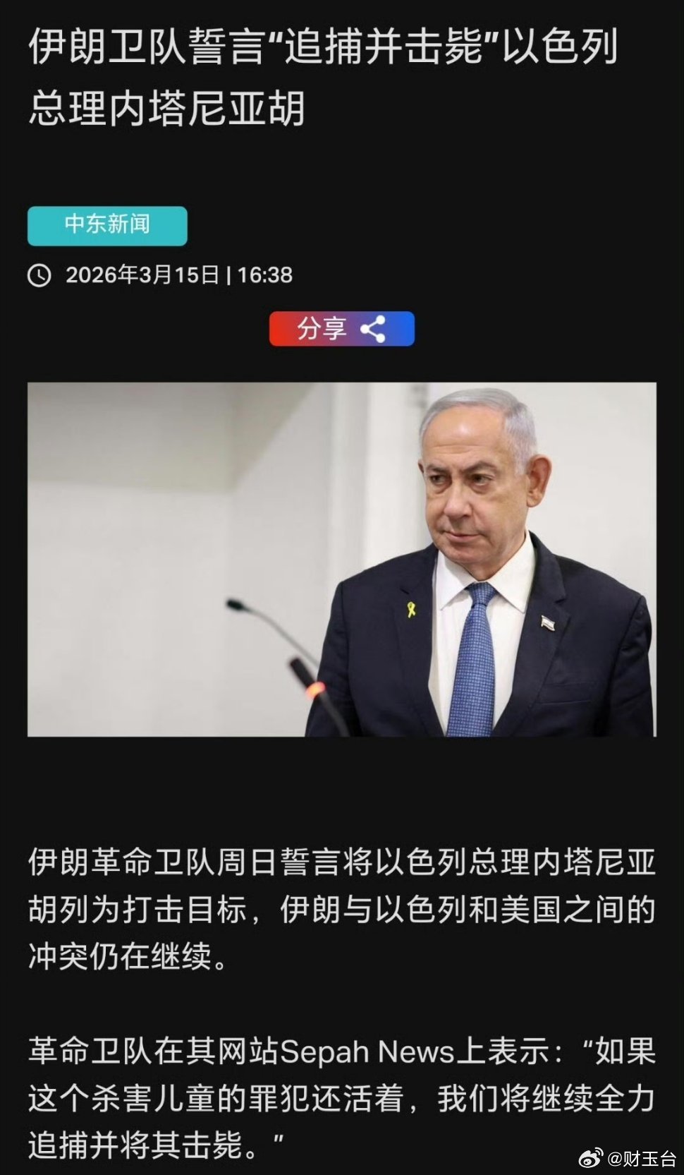 伊朗称将追杀以色列总理 伊朗革命卫队公开将以总理列为打击目标,措辞极端、性质严重,中东冲突彻底突破底线,进入极度危险的国家报复与斩首对抗阶段。这不是普通外交喊话,而是公开的追杀令,打破现代国际关系基本准则,把冲突从战场对抗推向针对国家领导人的极端报复。背后是美以与伊朗持续多轮高强度打击、双方伤亡与民生损失惨重、地区秩序濒临失控的残酷现实。战争没有赢家,* targeting 国家领导人*只会引发无底线循环,加剧人道灾难、推高油价、冲击全球稳定。国际社会必须紧急介入,推动停火降温,回到外交与国际法框架解决矛盾,而不是任由仇恨把整个中东拖入深渊。和平才是唯一出路,平民不该为极端对抗买单。