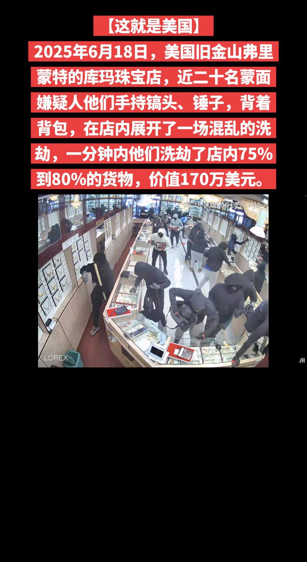 【这就是美国】2025年6月18日,美国旧金山弗里蒙特的库玛珠宝店,近二十名蒙面嫌疑人他们手持镐头、锤子,背着背包,在店内展开了一场混乱的洗劫,一分钟内他们洗劫了店内75%到80%的货物,价值170万美元。