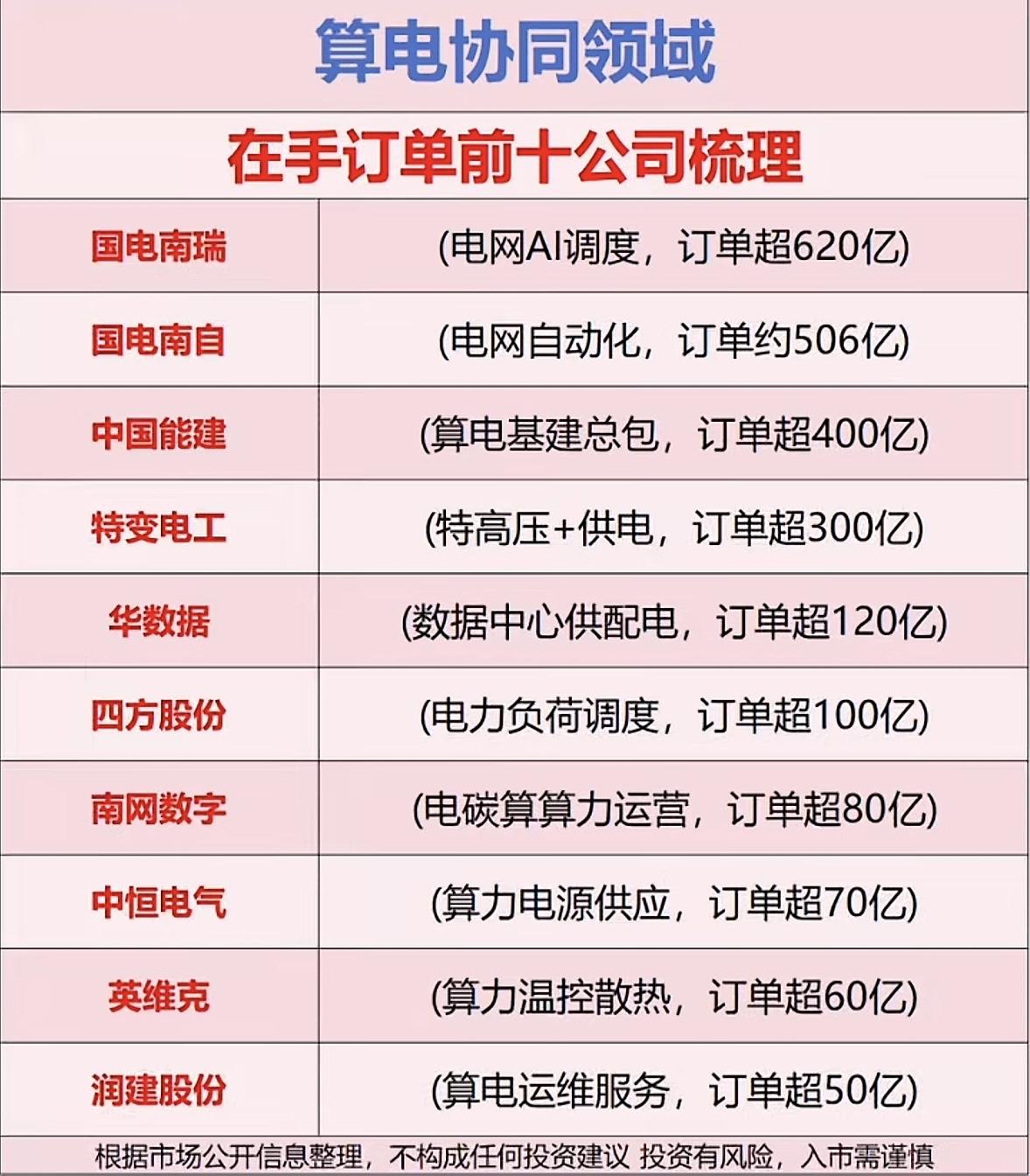光模块和算电协同领域,在手订单个股揭晓,第一名在手订单超过600亿 2026光模块企业订单排行揭晓啦!光模块订单Top10里,最低的都手握35亿订单,最高的狂揽320亿,排期到2028年。第十名光库科技,订单超35亿,铌酸锂调制器技术牛,给英伟达、博通供货,订单排到2026年底。第九名胜宏科技,订单超40亿,CPO用的PCP版技术好、散热强,中际旭创等都靠它供货,订单排到2027年一季度。 算电协同概念也在持续爆炒,3月11日A股市场,中国能建、节能风电领衔热榜。中国能建受益政策利好,节能风电获资金支持和业务进展。这俩领域都很有看头!