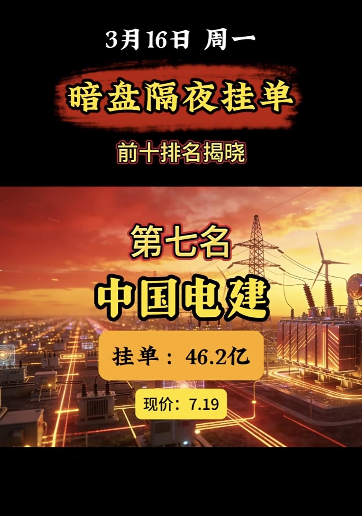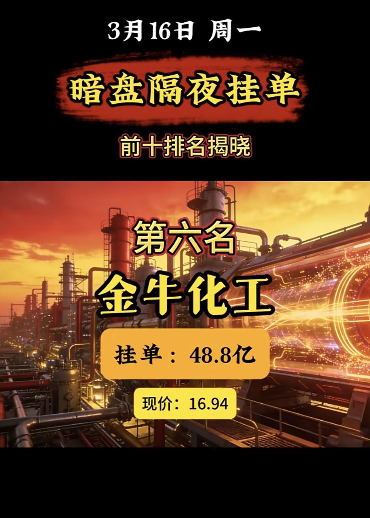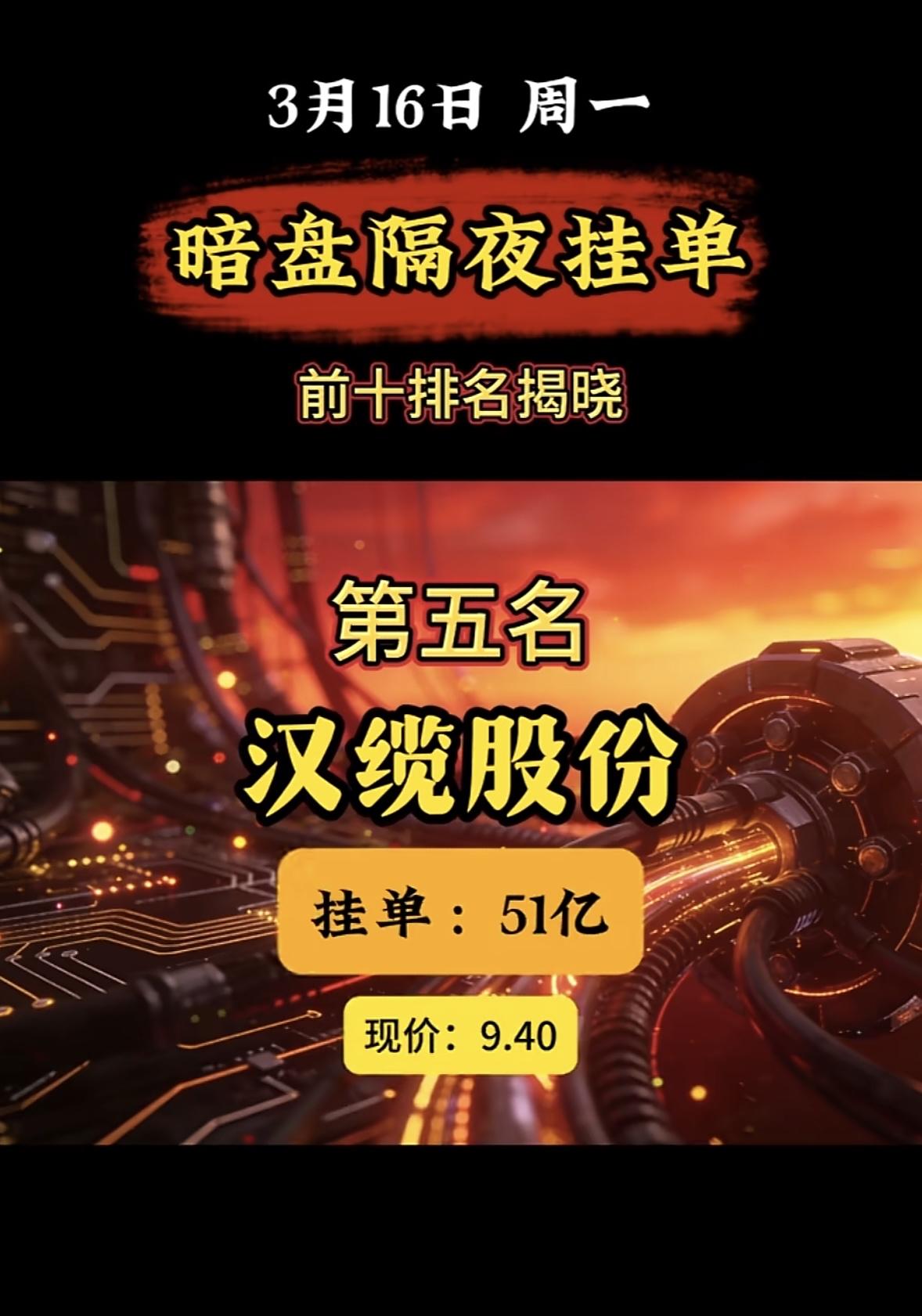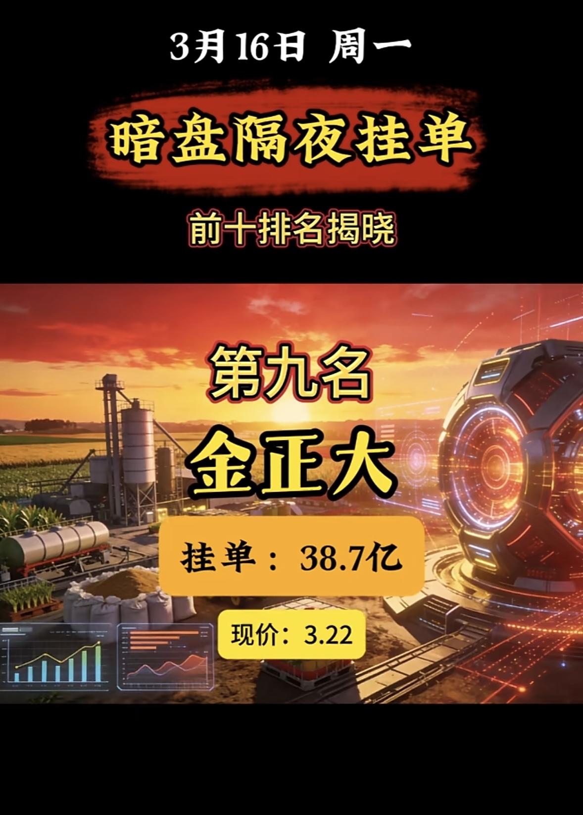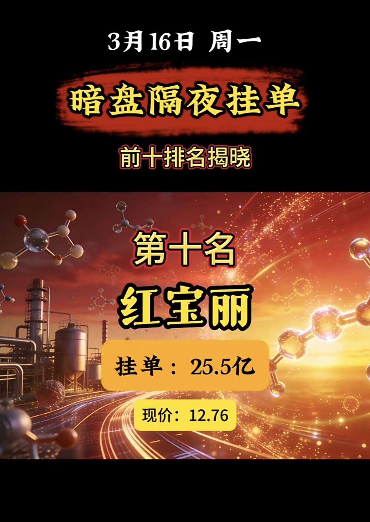 3月16日暗盘隔夜挂单前10名个股揭晓。 暗盘隔夜挂单榜又有新情况!3月16日周一的榜单里,红宝石丽位列第七,现价12.76,买单52.64亿,卖单37.63亿。而这次揭晓的榜单中,红宝石丽位列第十,挂单25.5亿,现价还是12.76。 对比3月16日排名前三的,中国电建买单113.21亿,金牛化工买单95.84亿,金正大买单85.65亿,红宝石丽的挂单量和它们比起来逊色不少。再看1月21日的榜单,第一名锋龙股份挂单32.3亿,红宝石丽这次的25.5亿也不算突出。这股市风云变幻,红宝石丽后续走势会如何呢,值得关注。