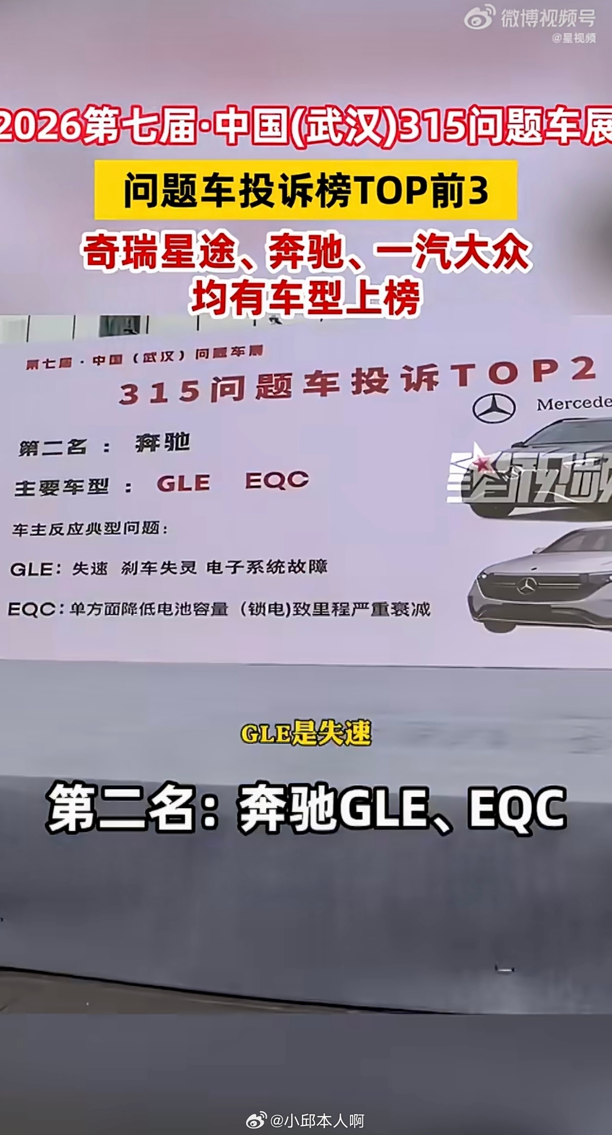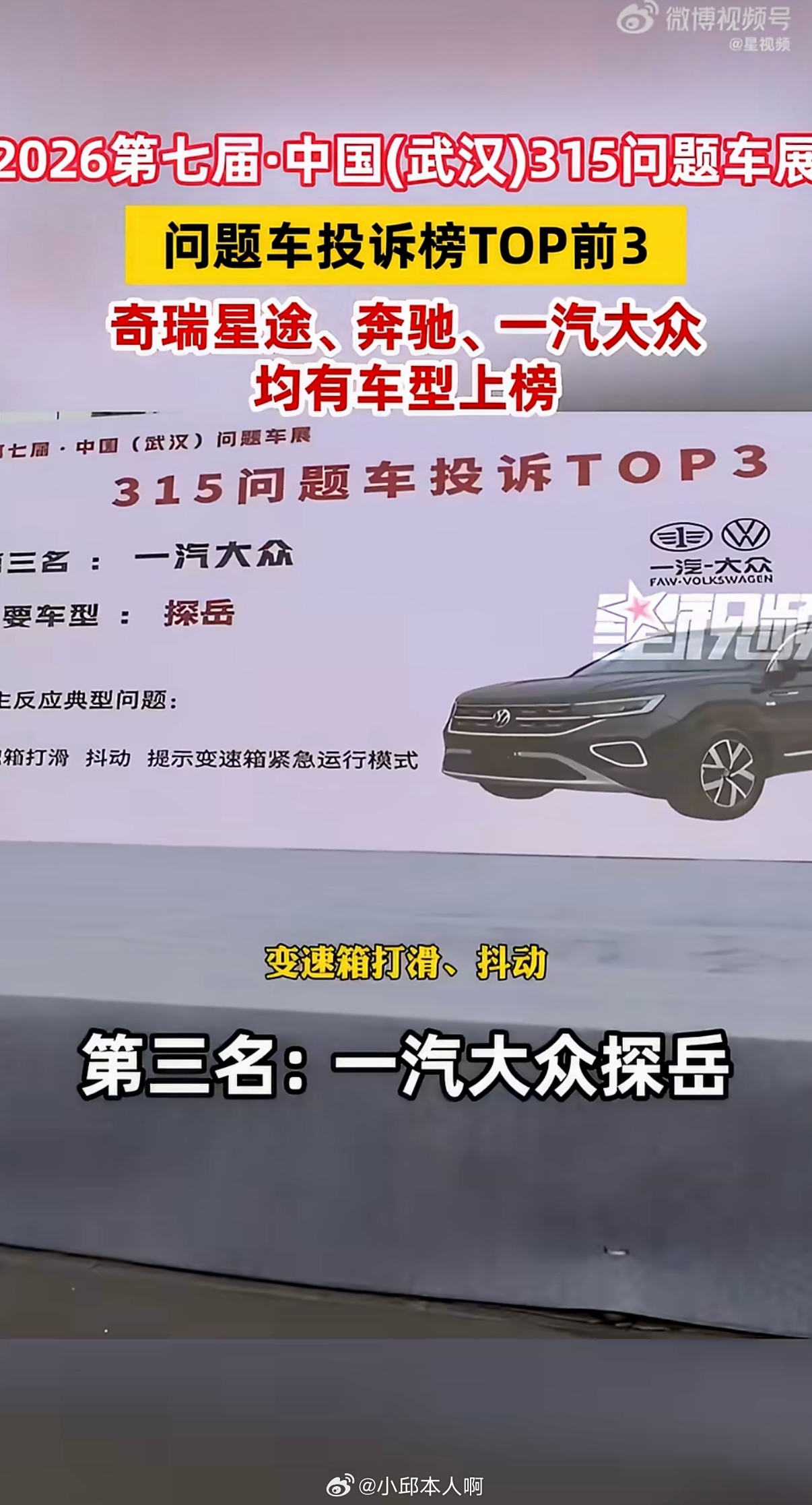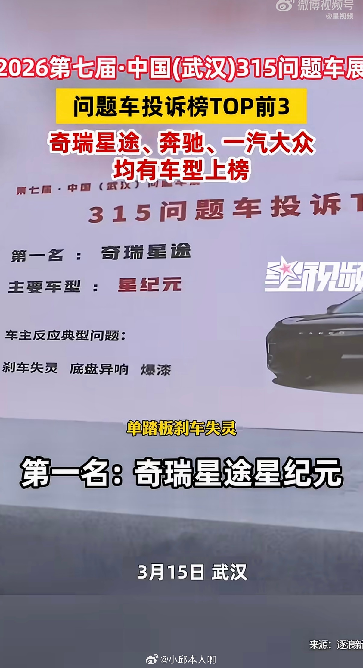 奇瑞再登问题车展投诉Top12026年武汉那边搞的315车展把问题车名单给公布了。