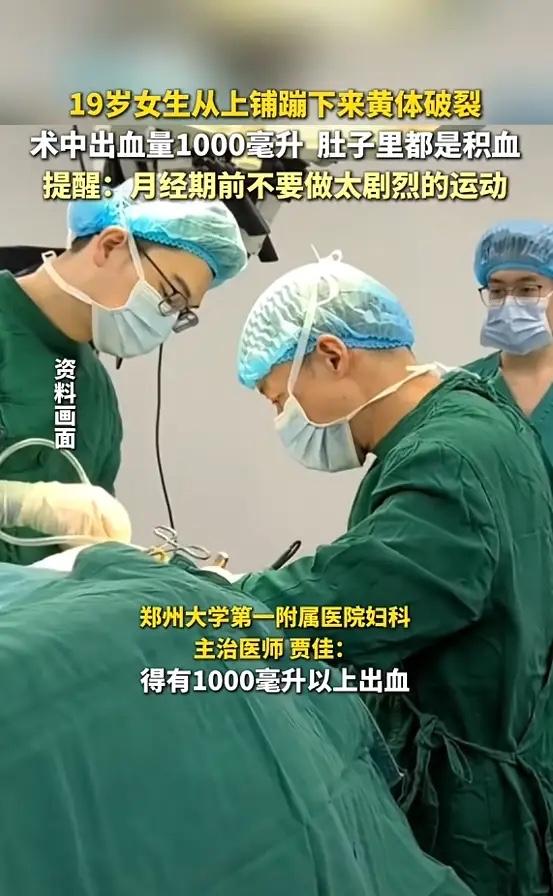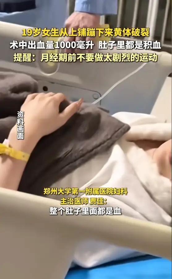 “太吓人了!”河南郑州,一19岁女生从宿舍上铺蹦下来后,突发剧痛,便去医院就诊,到医院时,女孩面色惨白,最终确诊为黄体破裂,腹腔大量出血,并且积血都到了肝脏,术中发现她盆腔积血至少有1000毫升以上,情况十分危急! 这个女生平时身体挺好,那天晚上在宿舍,她图省事,没走梯子,直接从上铺跳了下来。脚刚沾地,小腹就像被刀捅了一样,疼得她直不起腰,冷汗唰地就下来了。 室友们赶紧把她送到医院。医生一看她惨白的脸,就知道情况不对。检查结果出来她肚子里出了很多血,血甚至都流到了肝脏周围,盆腔里的积血超过1000毫升,相当于两大瓶矿泉水的量。再晚一点,可能命就没了。 医生诊断是“黄体破裂”,很多人可能头一回听说。女性每个月排卵后,卵巢里会形成一个叫“黄体”的小东西,它的血管丰富但壁很薄。在下次月经来潮前大概一周左右,这个“小气球”体积最大,也最脆弱。 这时候任何让肚子压力突然增大的动作,都可能把它“挤破”。像这个女生一样,从高处跳下来,对于脆弱的黄体来说,可能就是致命的。 这个病最危险的在于出血是在肚子里,外面根本看不见。一开始可能只是肚子疼,很多人会以为是吃坏了东西或者痛经,忍忍就过去了。可一旦血管破口大,血就会止不住地往腹腔里流,短时间内就能让人休克,抢救不及时真的有生命危险。 这个女生是幸运的,手术及时,捡回了一条命。但这件事给所有年轻女孩敲响了警钟。你的身体里,每个月都可能藏着这样一颗“不定时炸弹”。 在月经来临前的那一周,请对自己温柔一点。避免突然剧烈的腹部运动。从高处跳下、快速奔跑、做剧烈的卷腹,这些时候都要多留个心眼。保持大便通畅,别用力憋气。 如果突然出现一侧小肚子剧痛,尤其是还感觉恶心、想拉肚子却又拉不出来,甚至头晕、心慌。千万别硬扛,也别自己乱吃止痛药。那可能是内出血的信号。 马上去医院,挂急诊,告诉医生你什么时候来的月经。一个简单的B超就能看清楚。记住,在健康面前,没有“小题大做”。宁可白跑一趟,也绝不能错过宝贵的抢救时间。 各位读者你们怎么看?欢迎在评论区讨论。