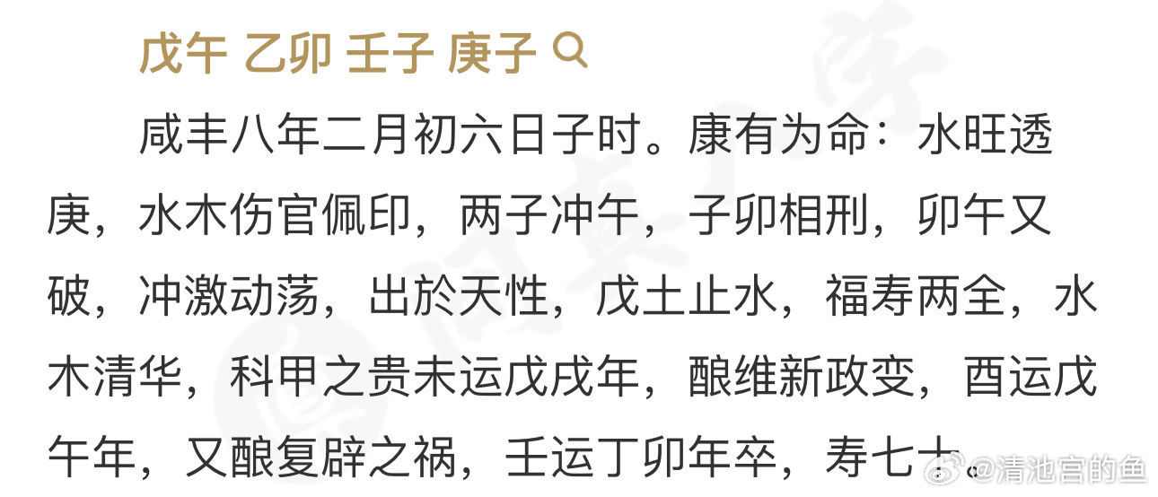 康有为这命挺有趣,他身强喜戊土官杀,戊土在年上,那是他最大的贵人,是光绪皇帝,康一辈子也是保皇派,想搞君主立宪,拥立光绪,后来还想复辟