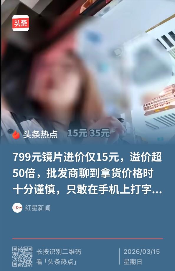 记者在亚洲最大的眼镜产品集散地,被誉为 “中国眼镜之都”的丹阳,发现一款市面上常见的1.61折射率镜片,进货价仅15元,而报价本标价却高达799元,溢价高达53倍!拿货后,即便打出诱人的“3折大促”售卖,仍能卖到240元左右,依然藏着16倍的暴利,行业水分大到惊人。 记者特意前往丹阳暗访,深入当地的眼镜批发市场和多家供货门店,一番调查下来,发现的情况让人咋舌。 其中最让人震惊的,就是一款市面上最常见的1.61折射率镜片——这种镜片几乎是近视人群的首选,不管是线下连锁眼镜店,还是普通的街边小店,都能看到它的身影,可它的进货价和售价,却有着天差地别的差距。 记者在一家供货门店咨询时,商家一开始十分警惕,不肯透露具体的拿货价格,直到记者表明是外地眼镜店的拿货商,商家才放下戒心。 但聊到具体价格时,依旧十分谨慎,全程不敢开口说话,只敢拿出手机,在屏幕上打字悄悄透露,生怕“隔墙有耳”,被同行或者相关部门听到。 从商家的打字内容里,记者得知,这款1.61折射率的镜片,进货价仅需15元一片,可当记者看到商家的报价本时,彻底被惊呆了。 同款镜片,报价本上的标价竟然高达799元,算下来溢价足足有53倍!也就是说,商家花15元进的货,转手就能标到近800元,中间的利润翻了几十倍,简直离谱。 更让人意外的是,即便商家打出诱人的“3折大促”,把这款镜片卖到240元左右,依然有超高的利润,折算下来,利润率也有16倍之多。 要知道,这还只是镜片的价格,一副完整的眼镜,还要加上镜架,而镜架的暴利程度,一点也不输给镜片。 据业内人士透露,市面上售价几百元的镜架,进货价大多在几十元,甚至十几元,有的低档镜架,进货价不足10元,却能卖到上百元。 据悉,丹阳作为中国眼镜之都,已经形成了覆盖原料、生产、组装、配送的完整产业链,拥有1600余家相关企业、5万余名从业人员,是全球最大的镜片生产基地和国家重要眼镜出口基地。 按道理来说,完整的产业链应该能降低成本,让眼镜价格更亲民,可实际情况却是,产业链的优势反而成了商家牟取暴利的“工具”,出厂价极低的眼镜,经过多级批发商、零售商的层层加价,最终落到消费者手里,价格就翻了几十倍。 记者在暗访中还发现,眼镜行业的暴利,还源于商家的各种“套路”。 很多商家会刻意炒作镜片和镜架的“功能概念”,比如把普通树脂镜片说成“防蓝光、防疲劳、防辐射”,把普通塑料镜架说成“航空板材、纯钛材质”,用一堆专业术语忽悠消费者,进而抬高价格。 更有商家会把杂牌眼镜贴上韩国、日本等国外品牌的标签,身价瞬间翻倍,利润也随之暴涨。 这段暗访视频被发布到网上后,很快引发了全网热议,网友们的评论炸开了锅,纷纷表达自己的不满和震惊。 不少网友留言说,平时配一副眼镜,动辄几百上千元,早就感觉眼镜店很赚钱,可从来没想过,利润竟然这么高,15元的镜片卖到几百元,简直是漫天要价。 还有很多网友直言,眼镜是很多人的生活必需品,尤其是近视人群,每隔一两年就要换一副,可这样的暴利定价,无疑是在坑老百姓的钱,希望国家能好好管管,规范一下眼镜行业的价格乱象,不让消费者再被“宰”。 也有网友分享自己的经历,说自己之前配了一副眼镜,花了800多元,现在想想,成本可能连100元都不到,越想越生气。 面对网友的质疑,很多人也提出了疑问,这样的高价定价,到底合不合法?从法律层面来看,目前我国并没有明确规定眼镜的定价标准,眼镜行业属于充分竞争的市场。 商家拥有自主定价权,一般情况下,只要商家明码标价,不隐瞒价格、不欺诈消费者,高价定价本身并不违法。 但如果商家存在虚假宣传、隐瞒成本、哄抬价格等行为,就涉嫌违法了。比如,商家把普通镜片宣传成“进口高端镜片”,把十几元的镜架说成“几百元的品牌镜架”,误导消费者购买,就违反了《消费者权益保护法》,消费者可以依法要求商家赔偿。 另外,如果多个商家串通起来,恶意抬高眼镜价格,形成价格垄断,也违反了《反垄断法》,相关部门会依法进行查处。 记者还了解到,眼镜行业的暴利,也和信息不对称有关。普通消费者大多不懂镜片、镜架的材质和成本,不知道一款镜片的真实价值,商家正是利用这一点,肆意抬高价格,赚取高额利润。 而且眼镜属于耐用消费品,消费者更换频率不高,很多人即便知道自己买贵了,也不会过多追究,这也让商家更加肆无忌惮。 目前,当地市场监管部门已经关注到此事,正在对丹阳眼镜市场展开全面排查,重点查处虚假宣传、价格欺诈、串通涨价等违法行为,规范市场秩序。 其实不止丹阳,全国很多地方的眼镜市场都存在类似的暴利问题,想要彻底改变这种现状,不仅需要监管部门加强监管,也需要消费者提高警惕,学会辨别,避免被商家忽悠。