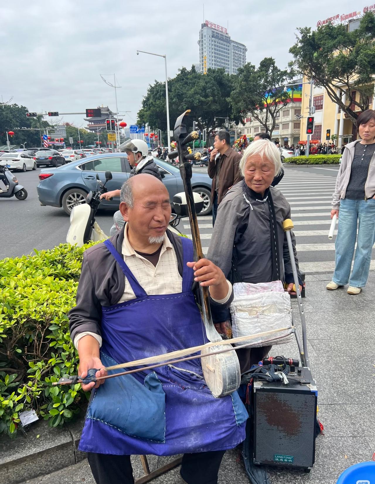 今天去朝阳广场逛街的时候突然看到这个双目失明的大叔大妈!突然感觉好像在哪里见过,他们在中山路旁边的十字路口拉二胡,这个二胡看起来已经有些年份了!虽然眼睛看不见,但是大叔的气色还是很好,身材魁梧! 应该是很久没有出来摆了,大叔跟前的塑料盆已经装了满满的现金,有一块的,有五块的,十块的,也有二十块的! 特别是等红绿灯的时候,大家听着大叔拉着凄凉略带伤感的二胡,就会纷纷给大叔大妈投钱!我也不由自主的投了20元!就当做做善事了! 回到家里跟老婆分享!老婆竟然说大叔大妈是骗子!他们在南宁有车有房!我总感觉他们不像骗子,看看大妈消瘦的身体,这么大的年纪了,为了生活,眼睛有看不见,能帮一点是一点吧!