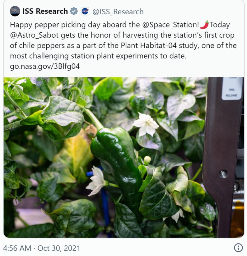 3月16日,据央视新闻直播间报道,昨天,中国🇨🇳空间站中由植物气雾培养装置培育樱桃番茄长势喜人,航天员对成熟的樱桃番茄进行拍照撤收,并将植株与摘下果实分别封存。 植物气雾培养装置是用于开展微重力环境下植物气雾高效培养关键技术验证,后续将接计划开展小麦、胡萝卜以及药食类植物的器物培养试验,拓展太空植物种植种\类与技术能力。