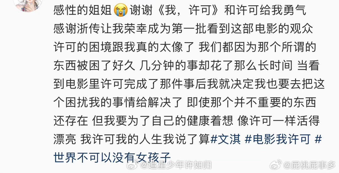 文淇我许可的力量在此刻具象化了 一个观众说看完电影后决定去做切除手术,她像许可一样被困住太久。文淇听到直接泪崩,专门录视频祝她顺利。银幕内外的两个女孩在这一刻重合,许可的勇气传递给了她,她终于能大声说出“我许可”。