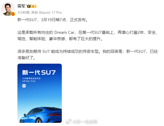 雷总预告安全、驾控、智能体验、豪华质感都有很大提升 小米新SU7卡布里蓝特别版