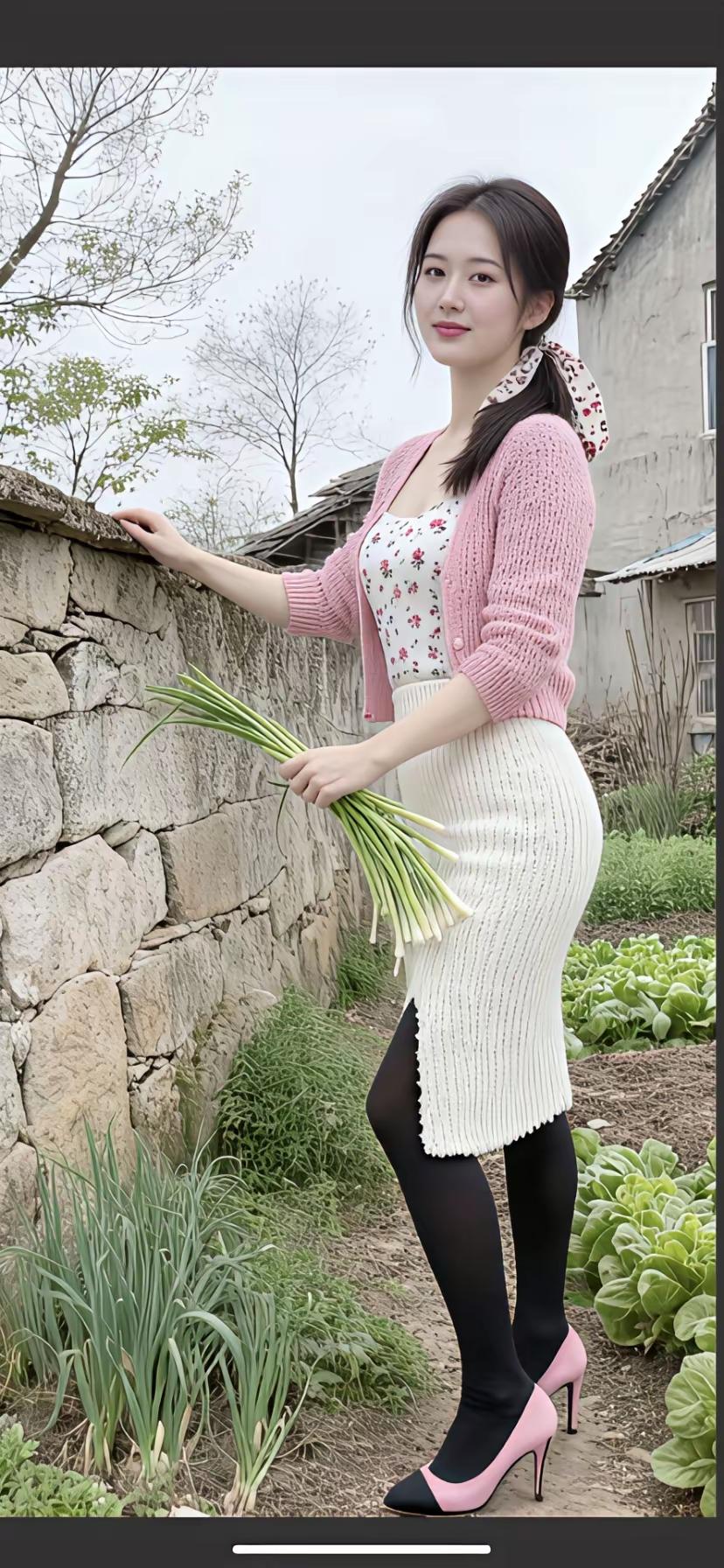 粉色上衣搭配米色长裙,温柔优雅