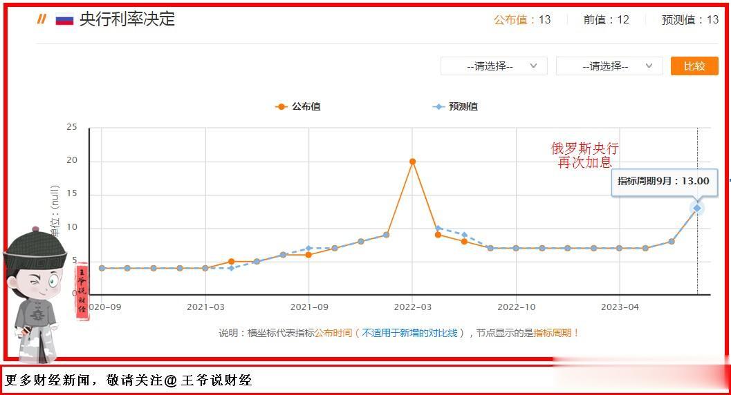 #财经新势力#【刚刚,俄罗斯央行加息100个基点!为什么?】 #俄罗斯央行宣布加息100个点# 9月15日,俄罗斯央行宣布加息100个基点,即:将关键利率从12%上调100个基点至13%。 13%,这是什么一个什么水平? @王爷说财经 注意到,这使得俄罗斯利率达到2022年春季以来最高。 值得一提的是,从今年7月开始,俄罗斯央行就开始收紧货币政策,为应对通货膨胀加快将基准利率上调1个百分点。 随后,也就是在今年8月,在卢布大幅贬值推升通胀预期的背景下,俄罗斯央行再次将基准利率上调3.5个百分点,至12%。 虽然连续加息3次,不过俄罗斯央行仍然表示,该国面临的通胀压力仍然很高。 最后,俄罗斯央行还将俄罗斯2023年全年通胀预期从5%-6.5%上调至6%-7%。#俄罗斯央行宣布加息100个基点#