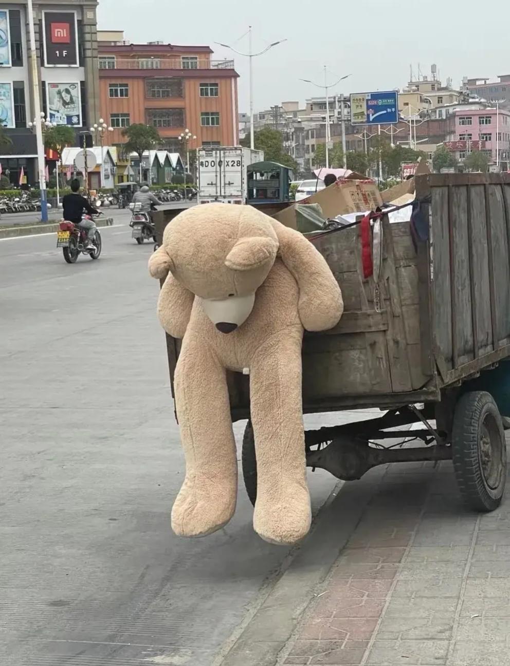 接儿子回家的路上,看到一只被主人丢弃的小熊,垂头丧气的被绑在垃圾车后面。儿子指着小熊难过的问:“妈妈,小熊是不是不听话,所以被它妈妈丢掉了?”
