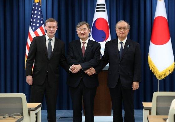 #韩国政治#【韩美日三国安保负责人决定为建设更加开放,繁荣的印太地区而共同努力】 韩美日三国安保室长决定,为应对朝鲜的挑衅,三国决定加强实时共享朝鲜导弹警报信息和制定三方训练计划等安保合作。 12月9日,韩国国家安保室长赵太庸和美国国家安全事务助理沙利文、日本国家安全保障局局长秋田武夫在龙山总统室举行三方会议后,举行了联合新闻发布会,并做出了上述表示。 此次会议是根据今年8月韩美日三国元首在美国戴维营峰会达成的协议进行的。 韩国赵太庸室长表示,“根据联合国安理会关于朝鲜的决议,国际社会再次确认了朝鲜的无核化义务和禁止其他国家与朝鲜进行军事合作的义务。韩美日三国决定加强合作,确保国际社会对朝鲜无核化的彻底履行。” 同时,他还补充道,“三国决定在网络经济、尖端技术、开发合作领域迅速有效地推进三国元首在达成戴维营协议的后续措施。决定在供应网、技术保护、共同研究、AI(人工智能)、治理、经济安保等领域进一步加强全面合作。” 沙利文则强调,“韩美日正在推进新的三国倡议,同时应对朝鲜的威胁和网络犯罪。” 同时他还表示,“韩美日三国为了应对朝鲜宇宙及弹道导弹试验,已经开始努力了。” 沙利文接着表示,“我们要打造更加自由、更加开放、更加繁荣、更加安全的印度太平洋。同时,我们将继续守护台湾海峡的和平与稳定,在东中国海、南海守护航行自由。”