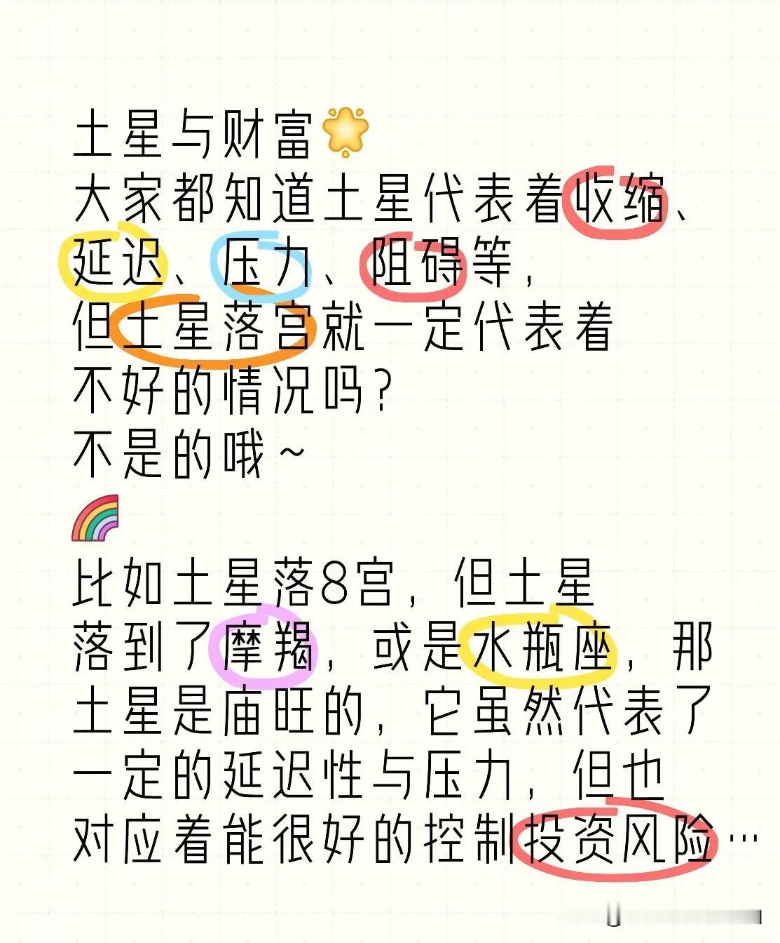 土星与财富[太阳] 大家都知道土星代表着收缩、延迟、压力、阻碍等, 但土星落宫就一定代表着不好的情况吗? 不是的哦~ 比如土星落8宫,但土星落到了摩羯,或是水瓶座,那土星是庙旺的,它虽然代表了一定的延迟性与压力,但也对应着能很好的控制投资风险, 很可能会进行非常成功的投资行为,那这个收益是非常大的。 🌸 再比如土星落2宫, 虽然也代表着一种对于生存的没安全感和危机感, 但如果土星落座庙旺的话,也代表着盘主会有很稳定的正财运,且非常善于储蓄,积少成多,不乱花钱,也是一笔不小的财富。🌷 相不单论,全盘分析🧐 #占星# #卟呤占星# #星盘# #土星# #财富# #运势财运解析#