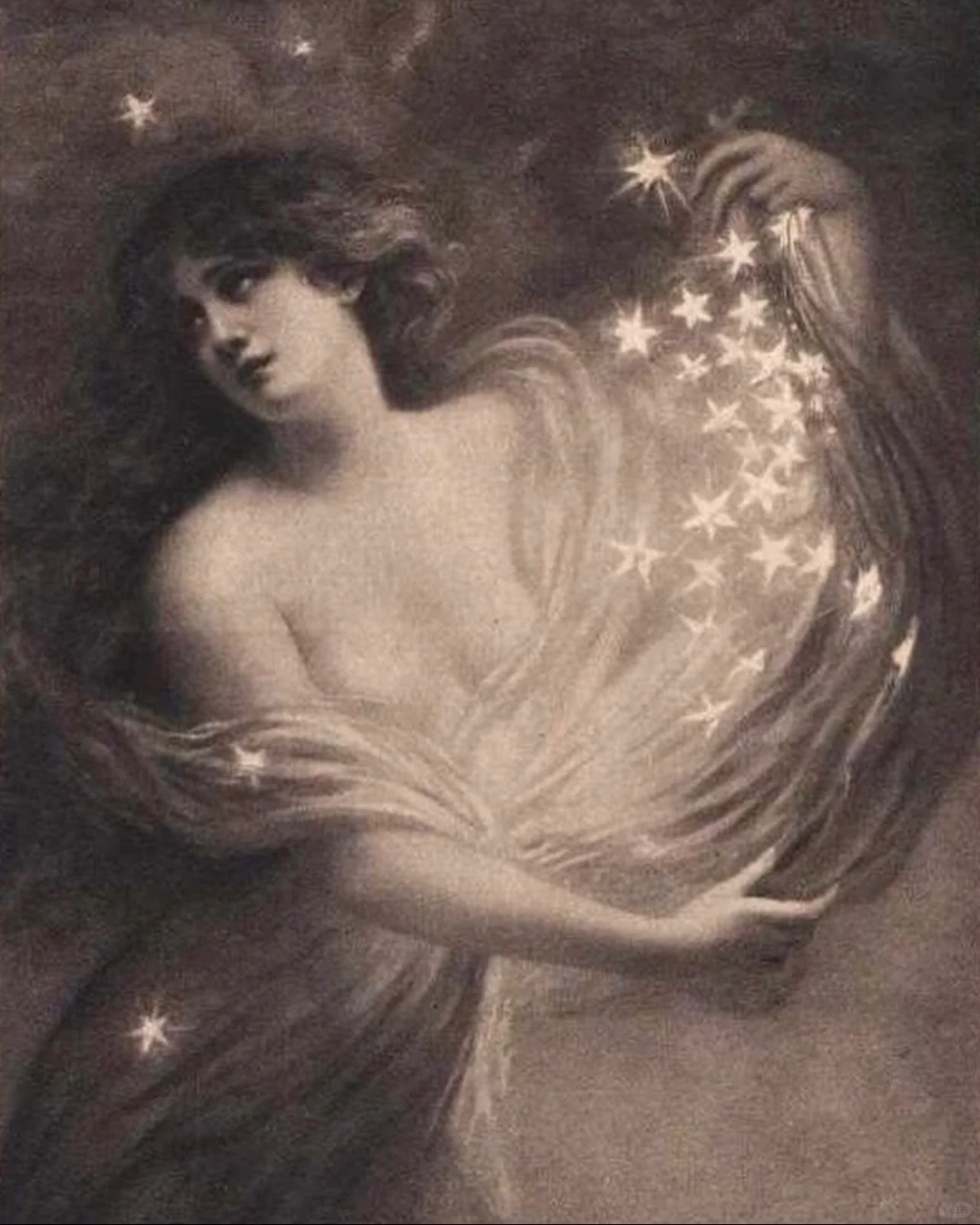 你知道吗 我出生在一颗星星的呵护下 我的月亮母亲给予我清凉 我的太阳父亲给予我热量 还有宇宙给予我居所 /脸庞,村庄 🪽 ART:Eard Bisson,The Stars, 1899 . .