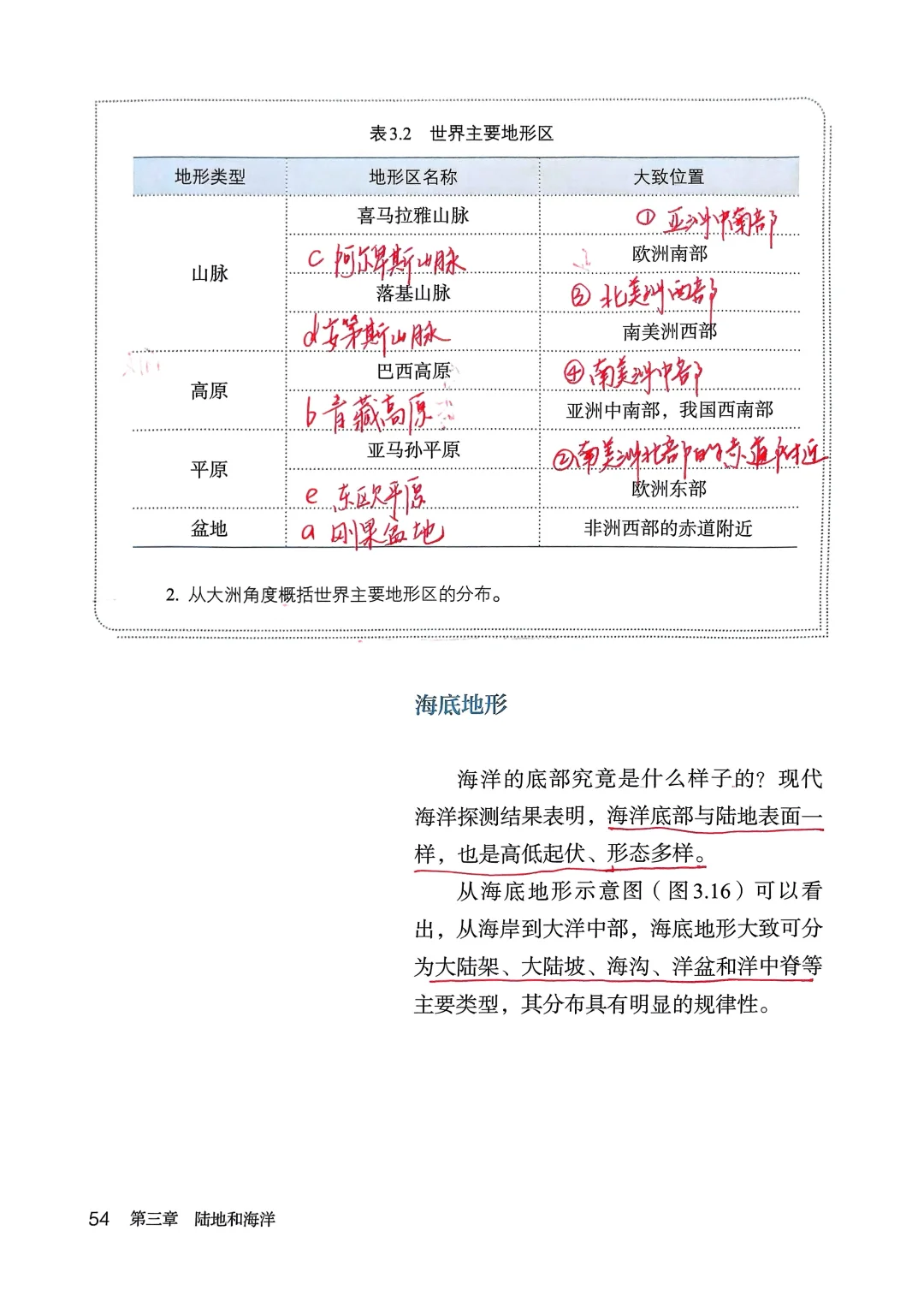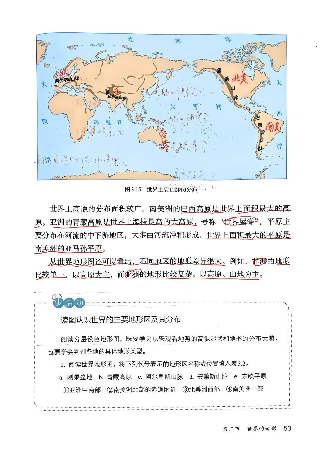 这一课多了好多东西呀让本来就不会的学生更不会了[抓狂R]五种地形基本类型:山地 平原 丘陵 高原 盆地 他们的特点P35 世界主要地形区及分布 海底地形