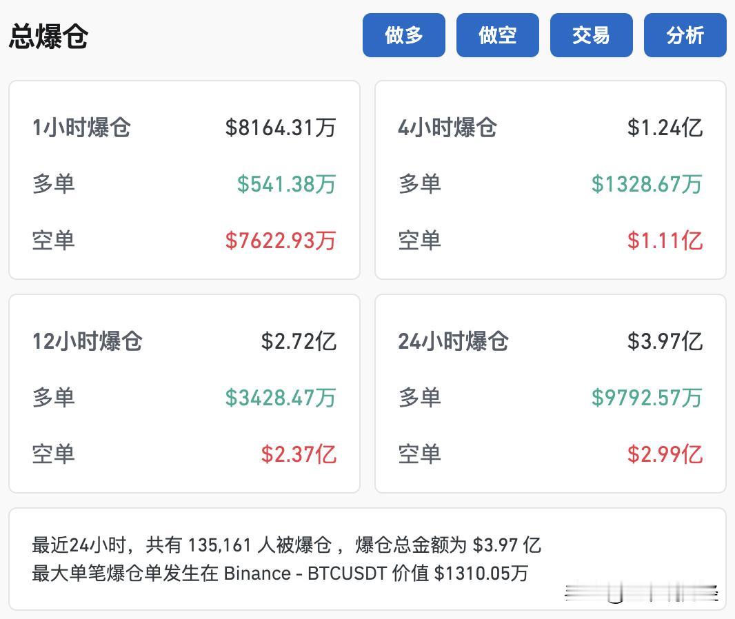 【太疯狂了!比特币突破79000美元!超13万人爆仓!】 11月10日,比特币盘中突破79000美元关口,创历史新高。截至北京时间13:25,比特币报79415.8美元/枚,24小时涨4%。 而CoinGlass数据显示,过去24小时,共有超13.5万人爆仓,爆仓总金额约3.97亿美元。 对此,HashKey Group首席分析师——丁肇飞分析评论称,特朗普锁定胜局对加密行业而言无疑是一个好消息,特朗普竞选期间一直在公共场合表现出对比特币等加密资产的积极态度。而且,他也亲身投入Web3领域——发行NFT、以家族名义推出DeFi项目,还接受比特币作为竞选捐款。 此外,丁肇飞预测,当前特朗普宣布胜选,已被视为加密货币市场的“发令枪”,预计在未来一段时间里,数字货币市场将持续消化这一利好消息。不过,中长期看,比特币等加密货币的涨势和流动性密切相关。 最后,丁肇飞提醒道,特朗普积极的财政政策,或许会导致通胀数据受到影响,继而影响美联储降息的实际进度,这是市场情绪之外,需要警惕的事情。 #比特币突破79000美元# #比特币突破79000美元关口##秋日生活记录#