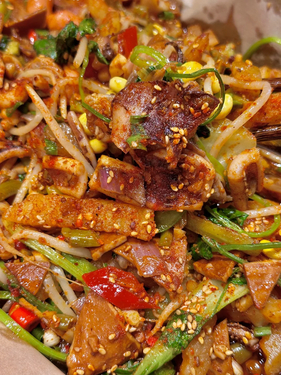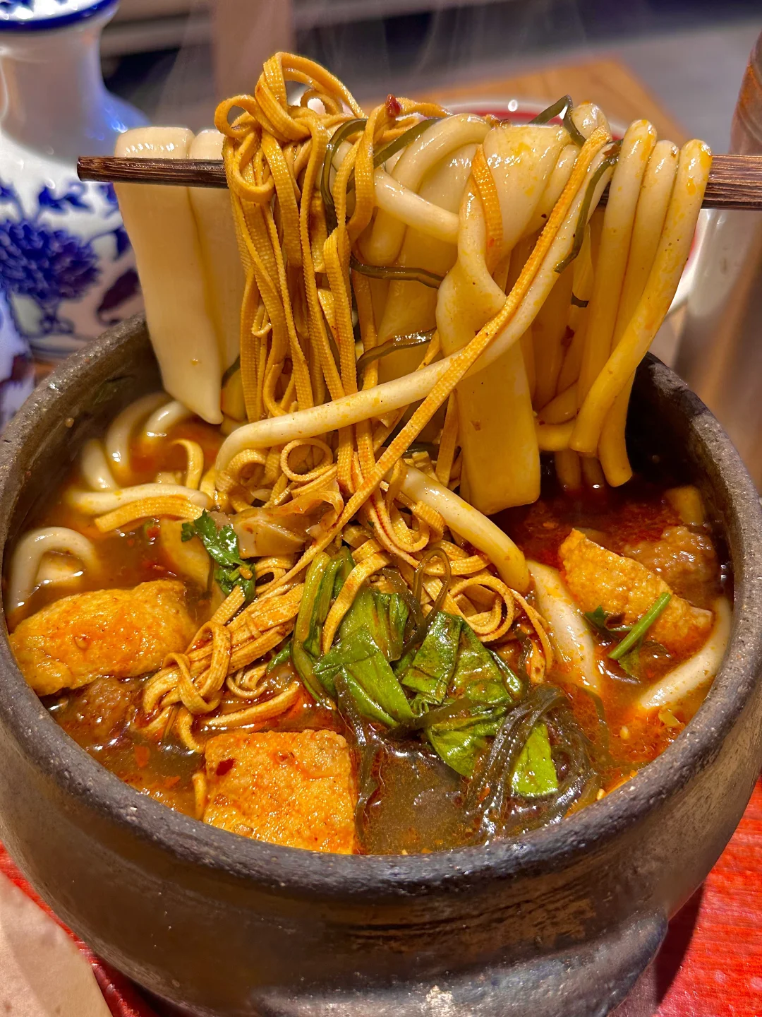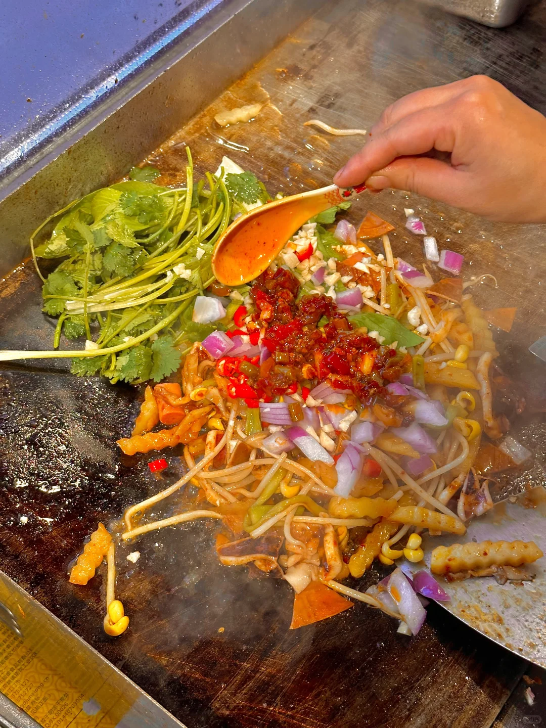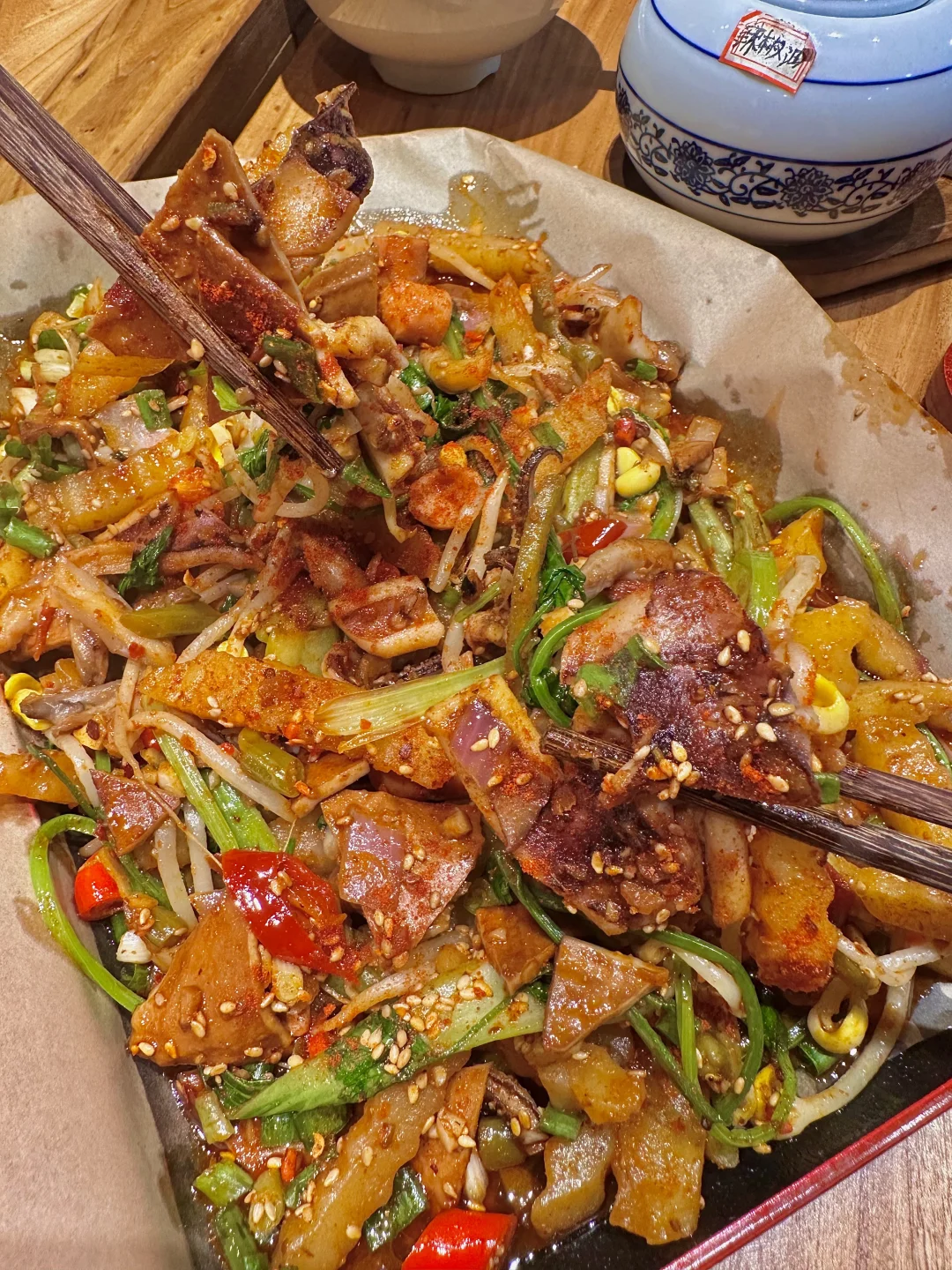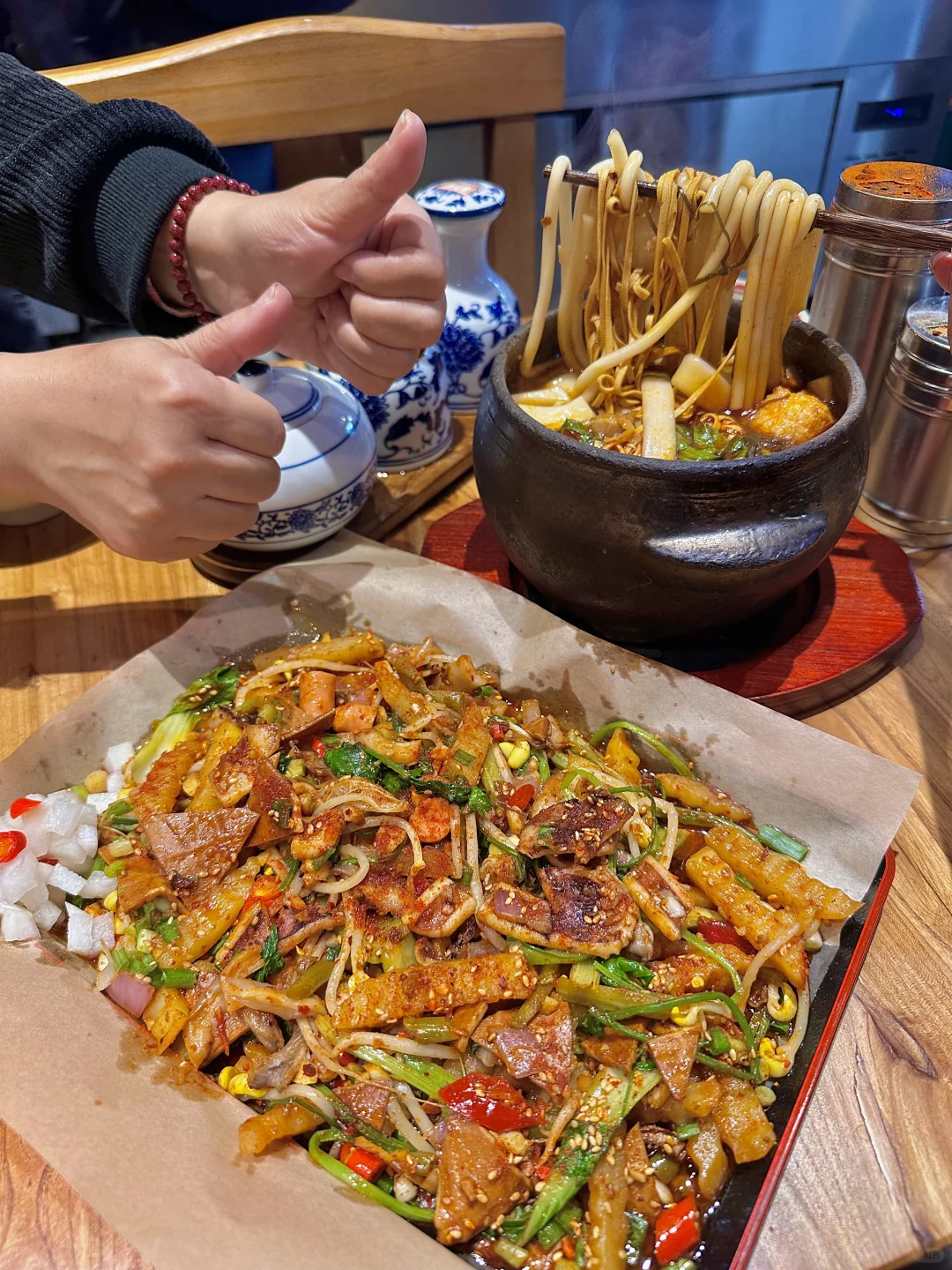 你永远可以相信小胡同里的小破店!! 藏在土豆粉店里的泡椒鱿鱼🦑好吃亖了啊 可以选各种食材一起在铁板上炒 鱿鱼、狼牙土豆、贡菜、香菜… 豇豆泡椒和辣椒面是灵魂 真的嘎嘎香👍巨巨巨下饭 店里自制的小泡菜开胃又解腻 讲真!为了他家我可以一直留在长春🥹