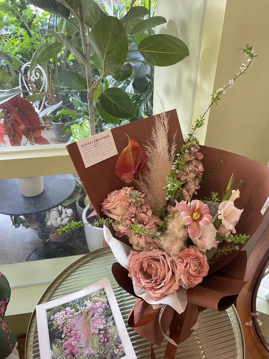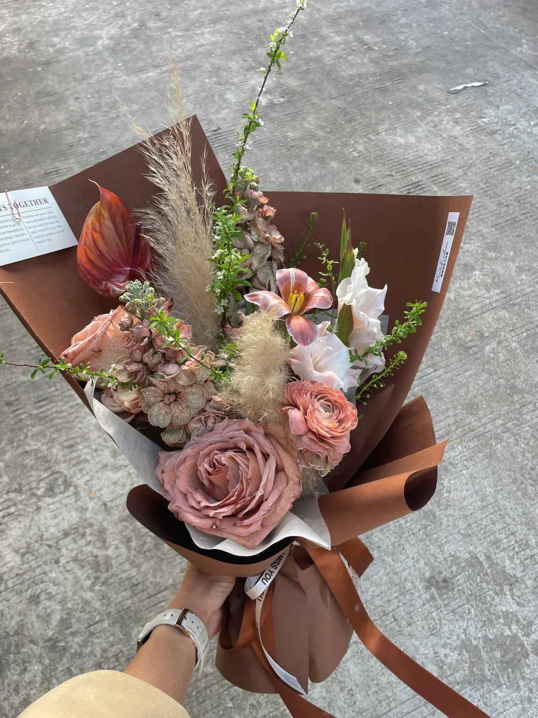 佛山花店 秋冬季节花束 花店日常 点缀生活的花束 小众花店 复古色系花束 布朗尼郁金香 带上喜欢的花去见想见的人 咖啡时间花束 顺德碧桂园花店