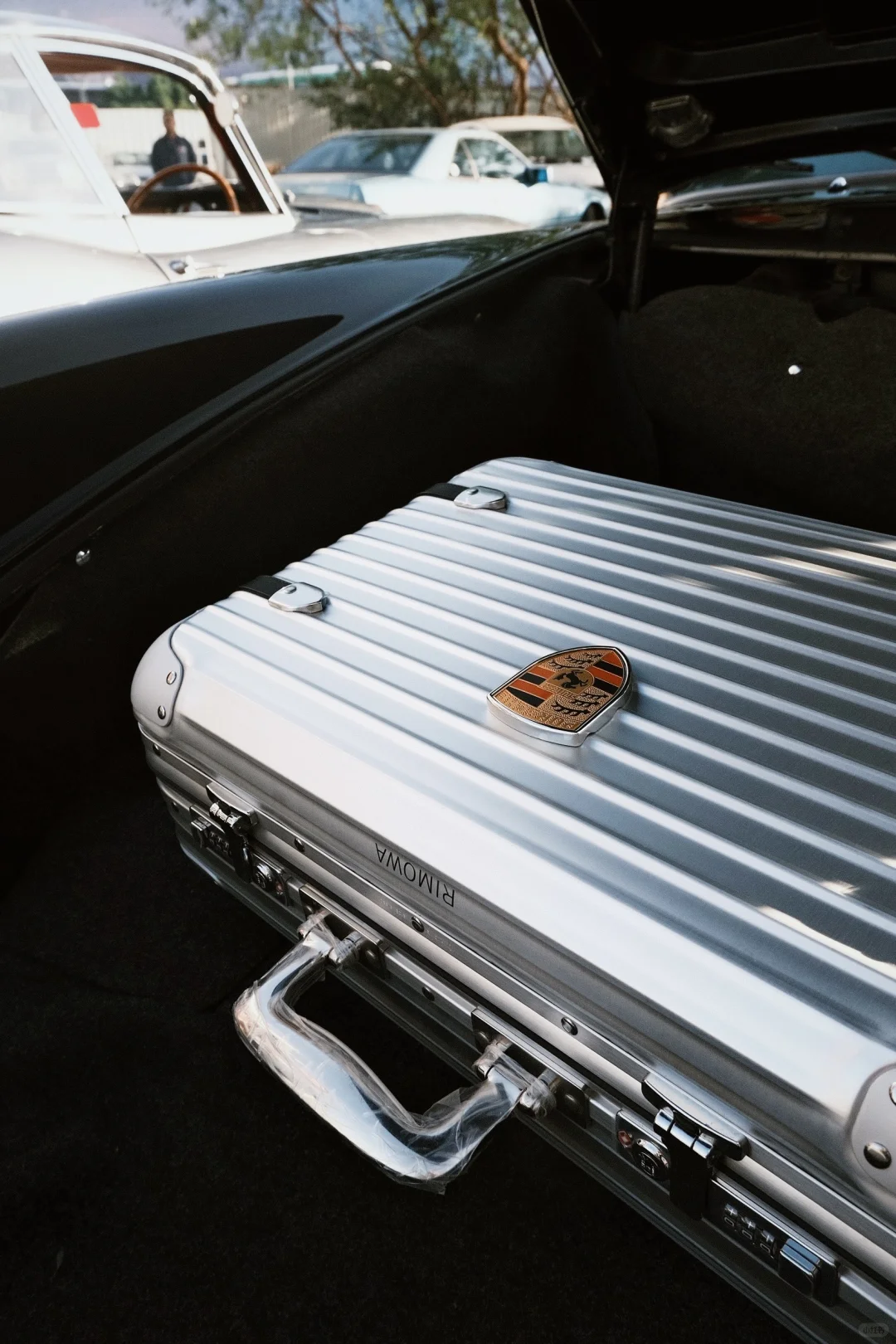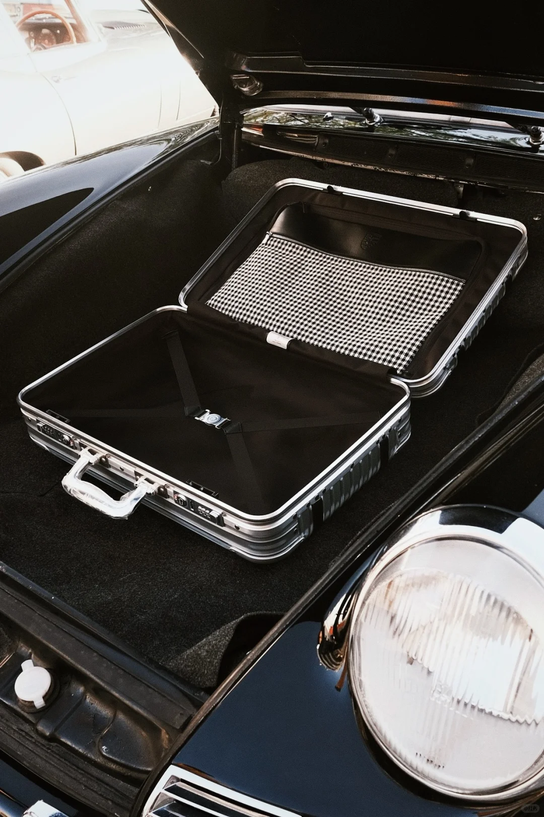 Targa那边,我们选择了保时捷自家与Rimowa联名的行李箱 Pepita。同为百年箱包品牌的Rimowa (1898) 依旧采用了标志性的铝镁合金制作凹槽纹理,由致敬初代911车型的Porsche厂标与黑色皮革等细节做点缀,以及吸人眼球的经典设计元素千鸟格纹饰面(Pepita)。该款式为两大德国品牌的联名款,全球仅发售911件,并且每个行李箱都有其专属编号。