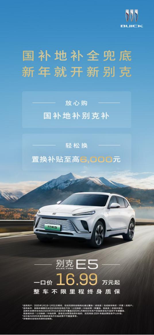 别克新年购车特惠,安心大礼包兜底,开启智慧出行新篇章! 随着消费者对于汽车品质和安全性能要求的提高,别克品牌在2025年一开始就推出了针对性强的举措,旨在进一步增强用户满意度。在1月期间,在别克授权经销商处通过置换或报废完成新车购买并已开票的用户,若国家或客户购车所在省份未在2025年3月31日前发布新的以旧换新补贴政策或政策未追溯至1月份,则可以获得国补地补兜底补偿以及品牌自身的补贴。特别是对于昂科威Plus而言,这款车型强调“多10%”品质,加之限时一口价16.99万元起的设定,使其在市场上迅速走红,12月销量达到了13540台,同比增长接近两倍。而在电动车领域,别克E5凭借出色的续航能力和安全记录,如累计行驶5亿公里0自燃、碰撞事故0起火、一年行驶0衰减,以及多次蝉联权威机构合资纯电保值率第一等成就,证明了其在新能源领域的地位。面对如此诱人的条件和高质量的产品,对于正在考虑更换座驾的人来说,此时无疑是最佳购入时期。