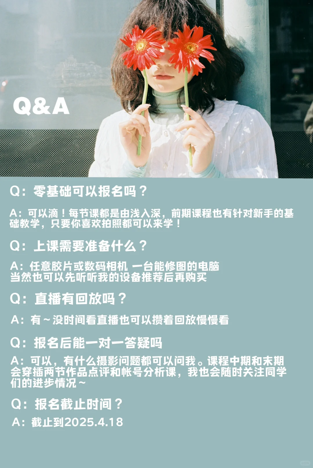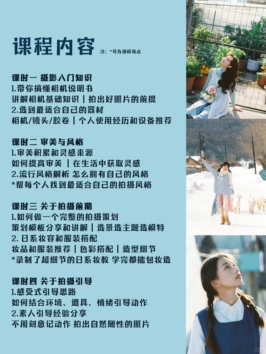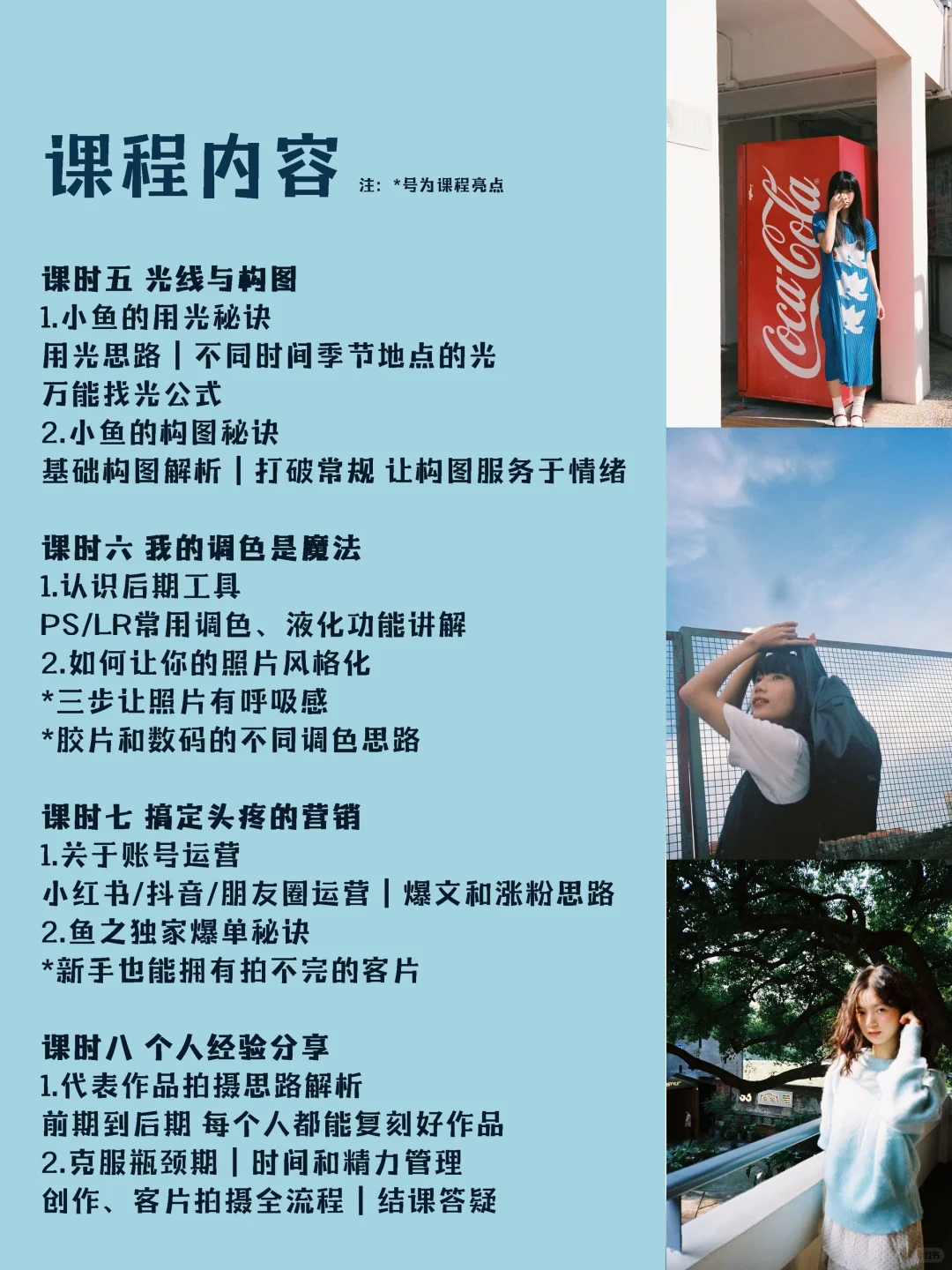 课程详情都在海报里啦 认真更新作品的一年多来,一直都有人来问什么时候开课,带拍过两场,开过一次专题分享课,现在我的第一期摄影网络课程终于来啦!!! 课程共有八个课时,十六个章节,涵盖了人像拍摄的前期到后期,会毫无保留地把我理解的摄影知识和感受到的东西都教给大家~ 期待和大家一起分享一起友好交流,一起用镜头感知这个世界,保持热忱🫶