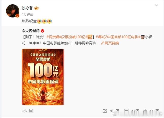 刘亦菲发文祝贺哪吒2破百亿刘亦菲热烈祝贺哪吒2票房破100亿刘亦菲的祝贺就